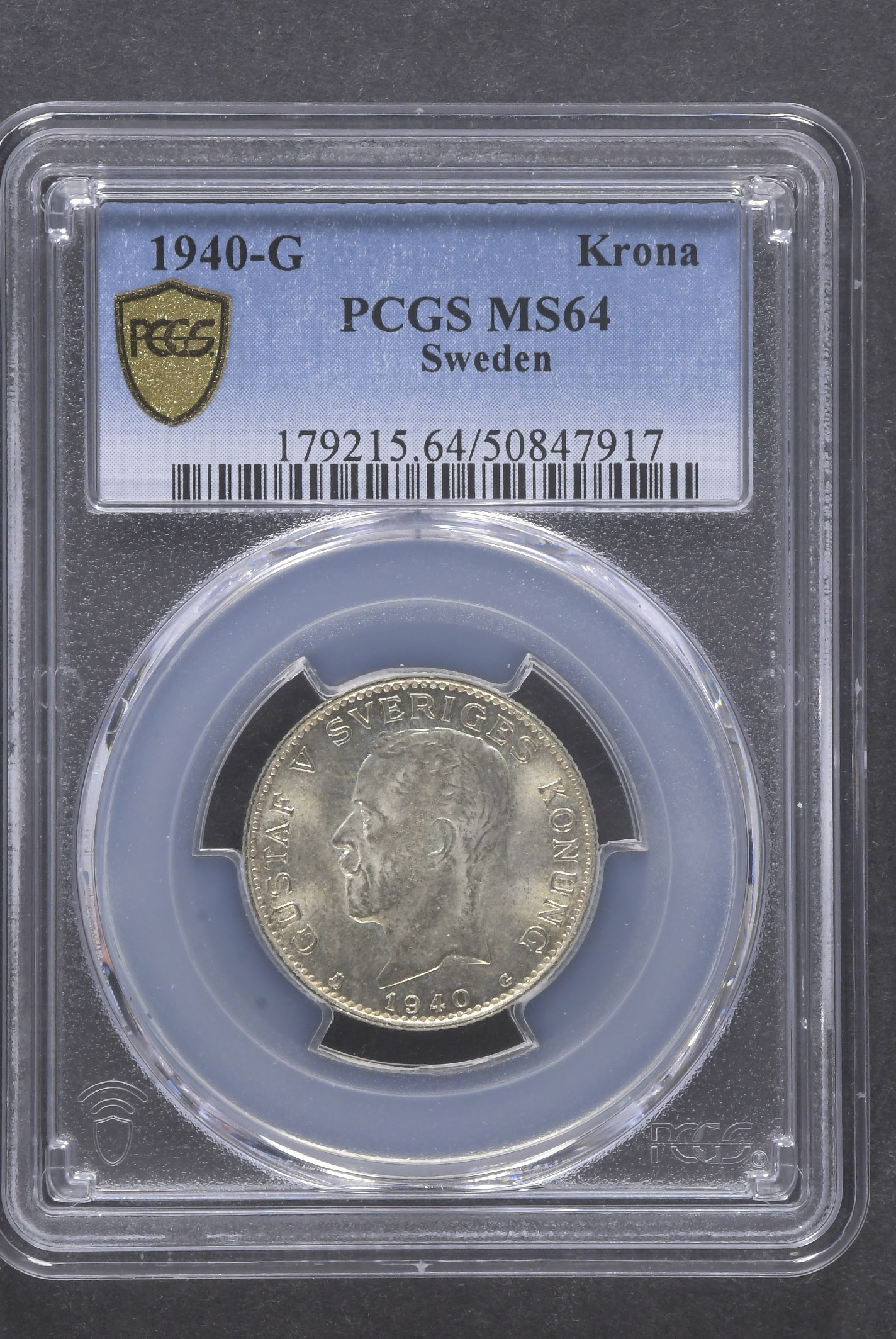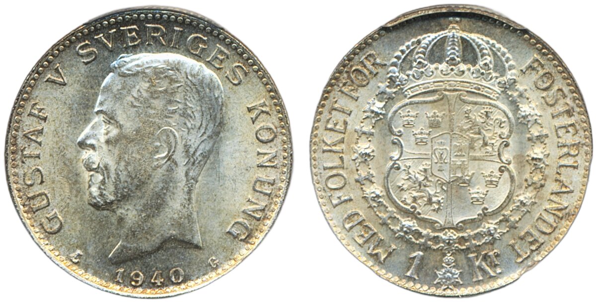 Coins, Sweden. Gustav V, MIS I.26a, 1 krona 1940. Beautifully toned. Graded by PCGS as MS64. 01/0. See certification at PCGS