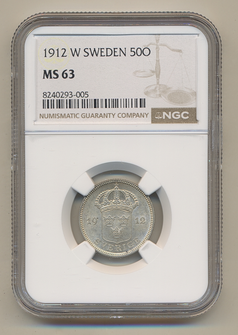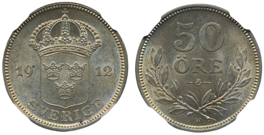 Coins, Sweden. Gustav V, MIS I.2, 50 öre 1912. Graded by NGC as MS63. 01/0. See certification at NGC
