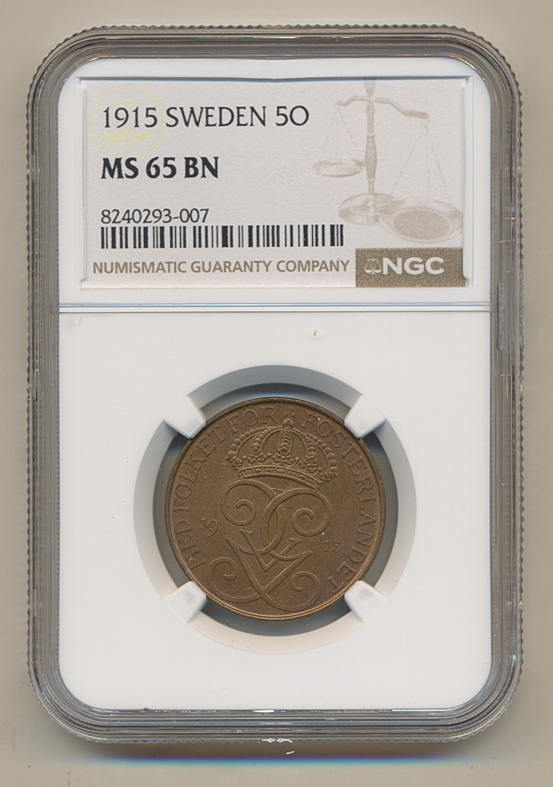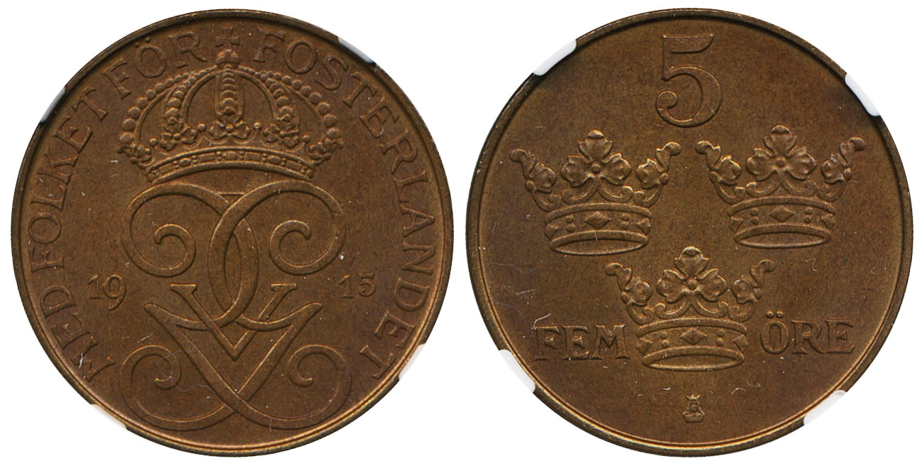 Coins, Sweden. Gustav V, MIS I.7, 5 öre 1915. Graded by NGC as MS65 BN. 0. See certification at NGC