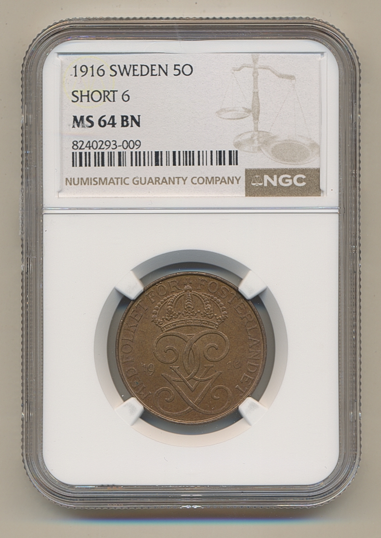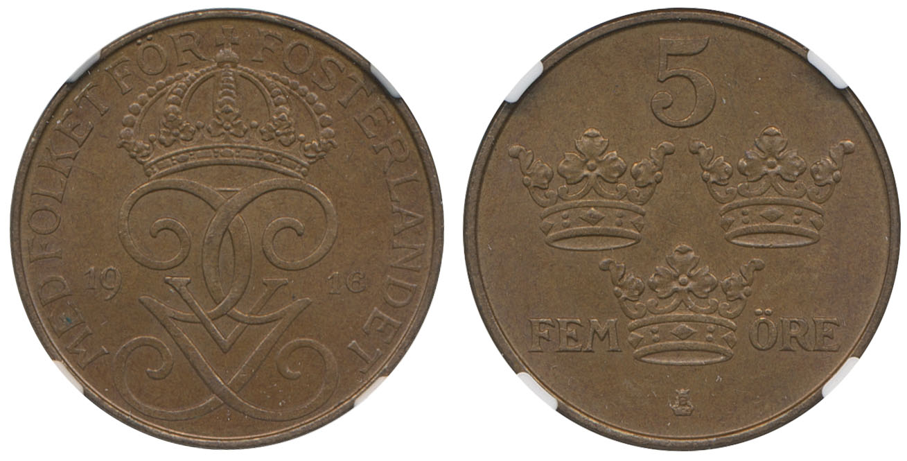 Coins, Sweden. Gustav V, MIS I.8b, 5 öre 1916. Short 6. Graded by NGC as MS64 BN. 01/0. See certification at NGC