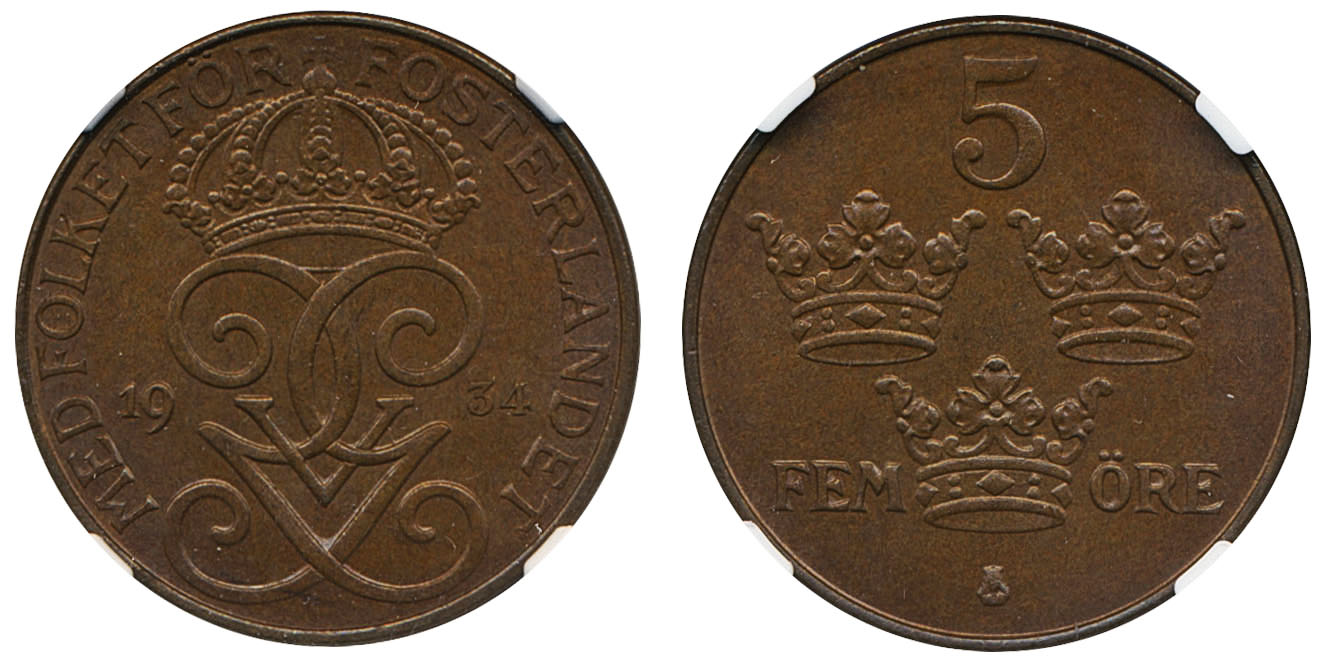 Coins, Sweden. Gustav V, MIS I.25, 5 öre 1934. Graded by NGC as MS65 BN. 0. See certification at NGC