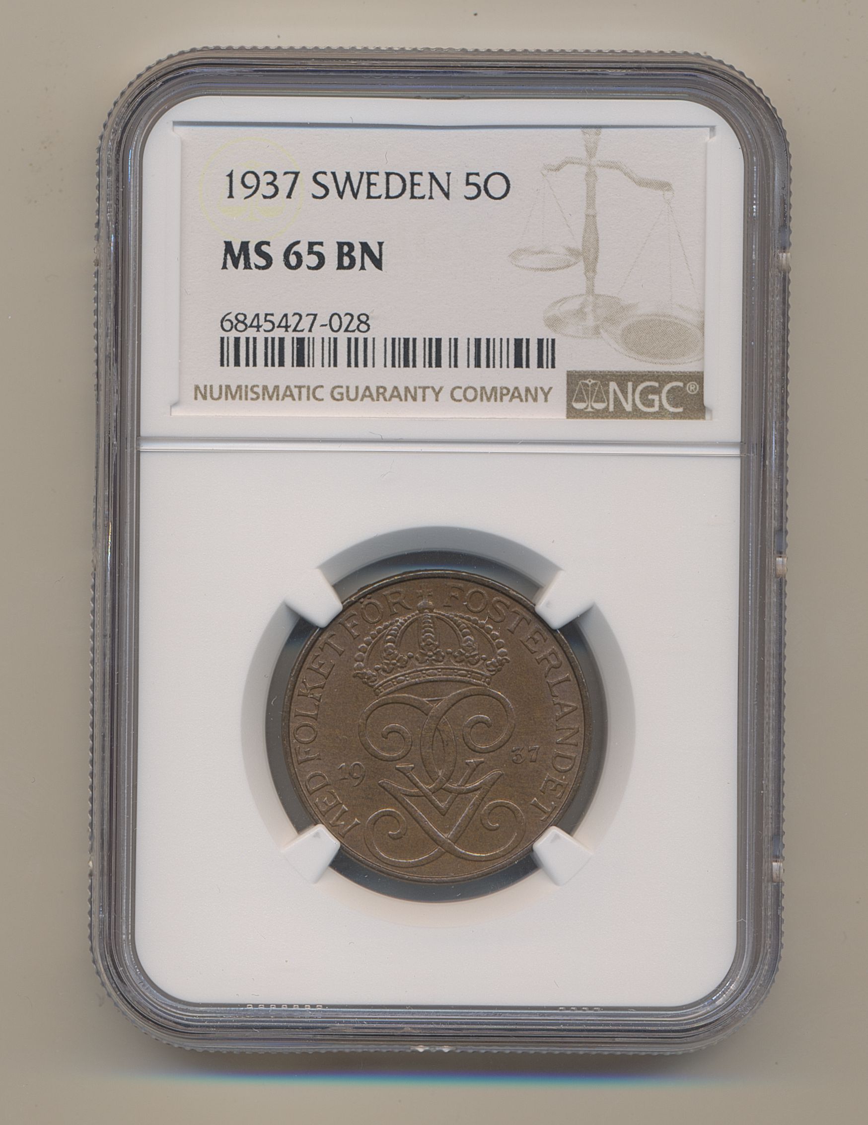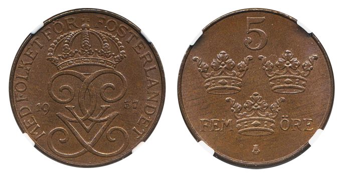 Coins, Sweden. Gustav V, MIS I.28, 5 öre 1937. Graded by NGC as MS65 BN. 0. See certification at NGC