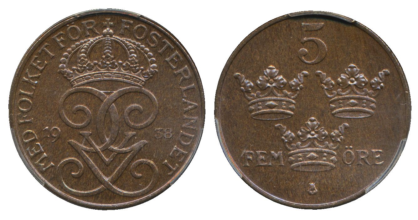Coins, Sweden. Gustav V, MIS I.29a, 5 öre 1938. Graded by PCGS as MS66 BN. Superb example with full prooflike surfaces. 0. See certification at PCGS