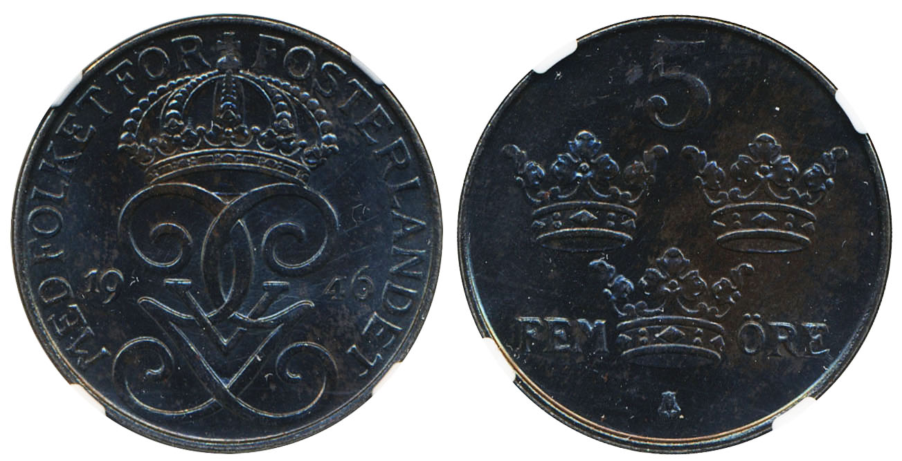 Coins, Sweden. Gustav V, MIS II.9, 5 öre 1946. Graded by NGC as MS63. 01/0. See certification at NGC