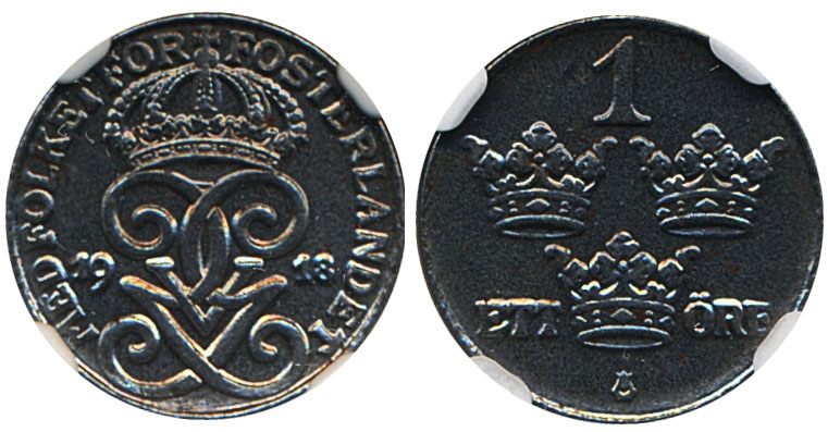 Coins, Sweden. Gustav V, MIS II.2, 1 öre 1918. Graded by NGC as MS64. 01/0. See certification at NGC