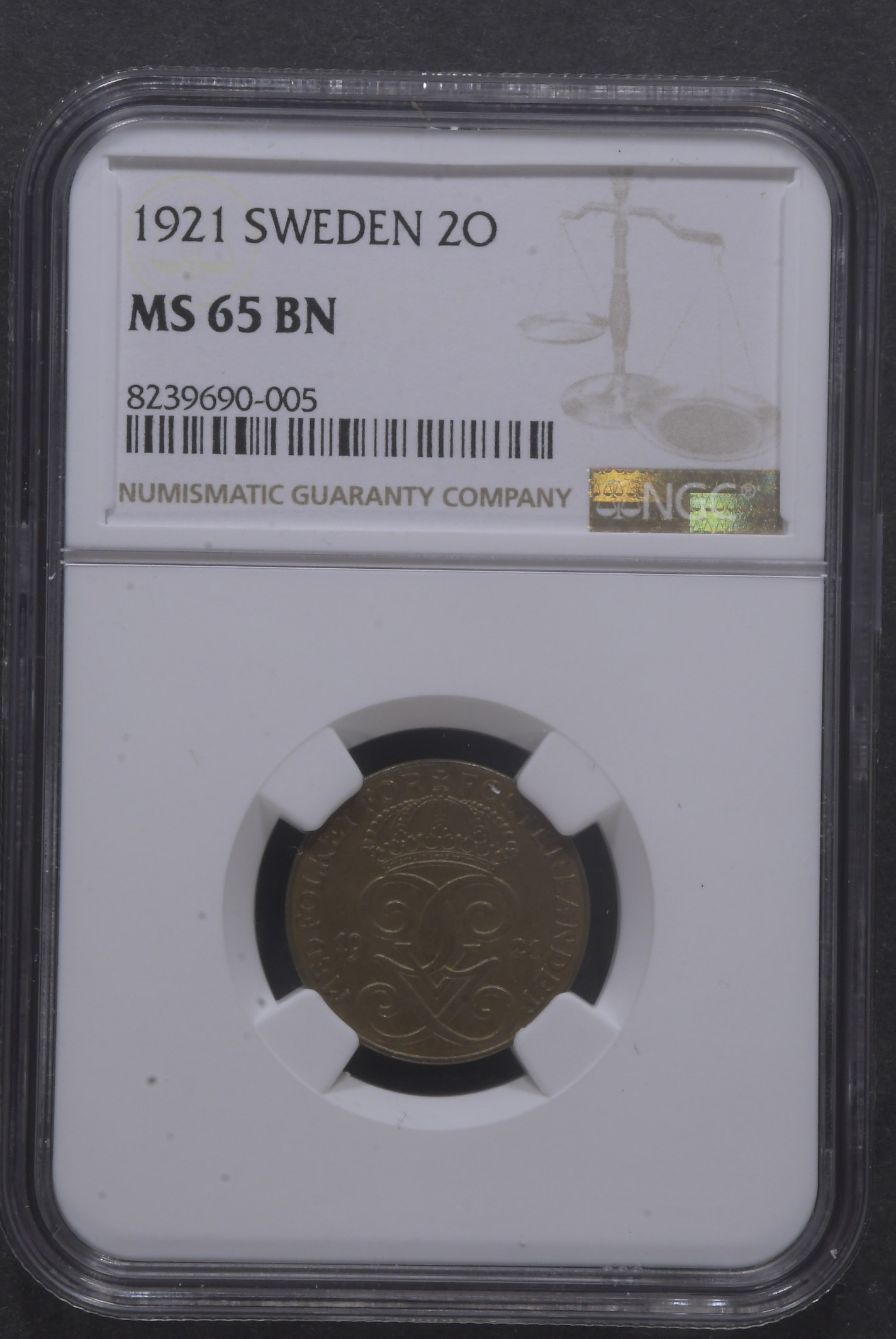 Coins, Sweden. Gustav V, MIS I.15, 1 öre 1925. Graded by NGC as MS65 BN. 0. See certification at NGC