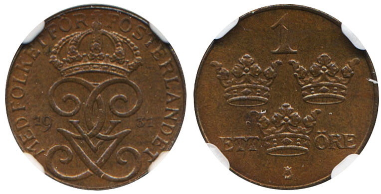 Coins, Sweden. Gustav V, MIS I.22, 1 öre 1931. Graded by NGC as MS65 BN. 0. See certification at NGC