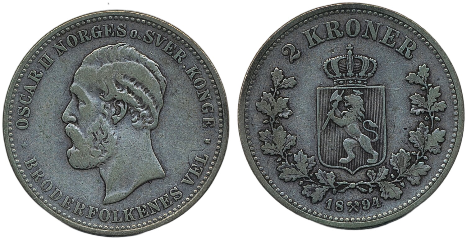 Coins, Norway. Oskar II, NM 24, 2 kroner 1894. 14.79 g. 1/1+.