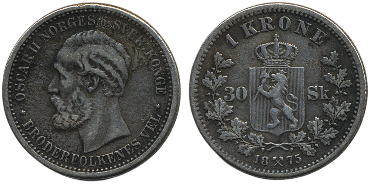 Coins, Norway. Oskar II, NM 30, 1 krone 1875. 1/1+.