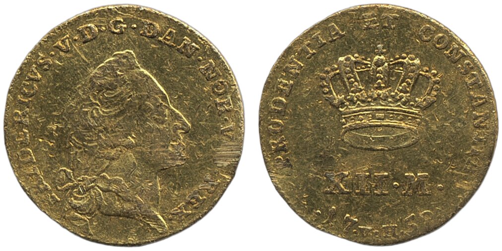 Coins, Denmark. Frederik V, Sieg 21.3, 1 kurantdukat (12 mark) 1759. 3.07 g. Scrape. 1.