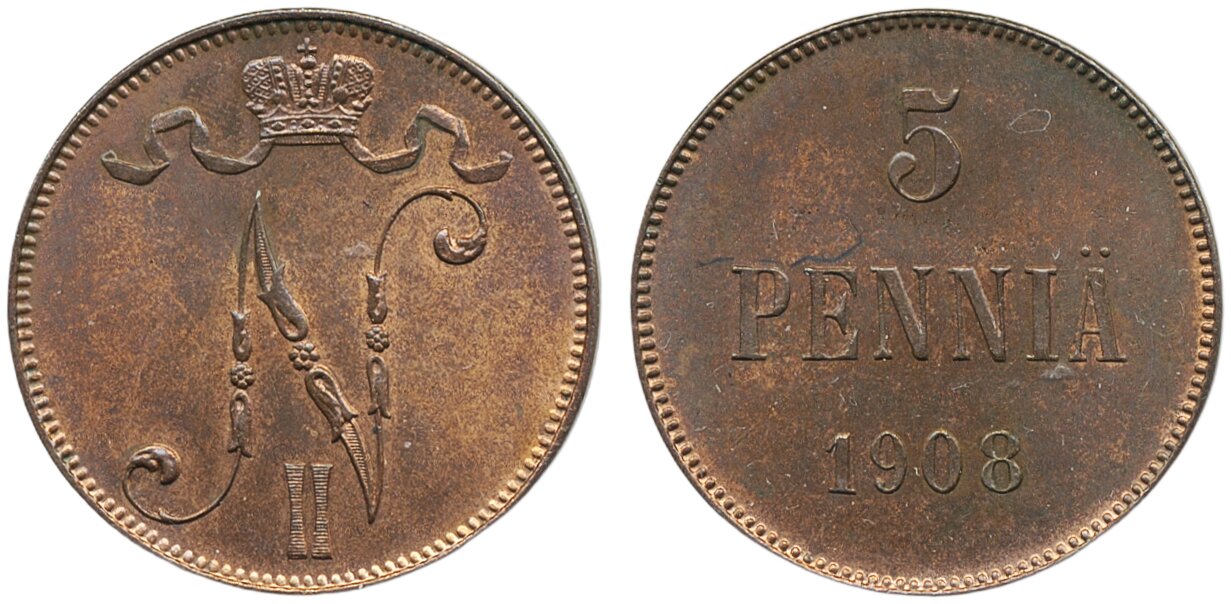 Coins, Finland. Nicholas II, Bitkin 449, 5 penniä 1908. A beaufiful specimen with some red luster. 01/0.