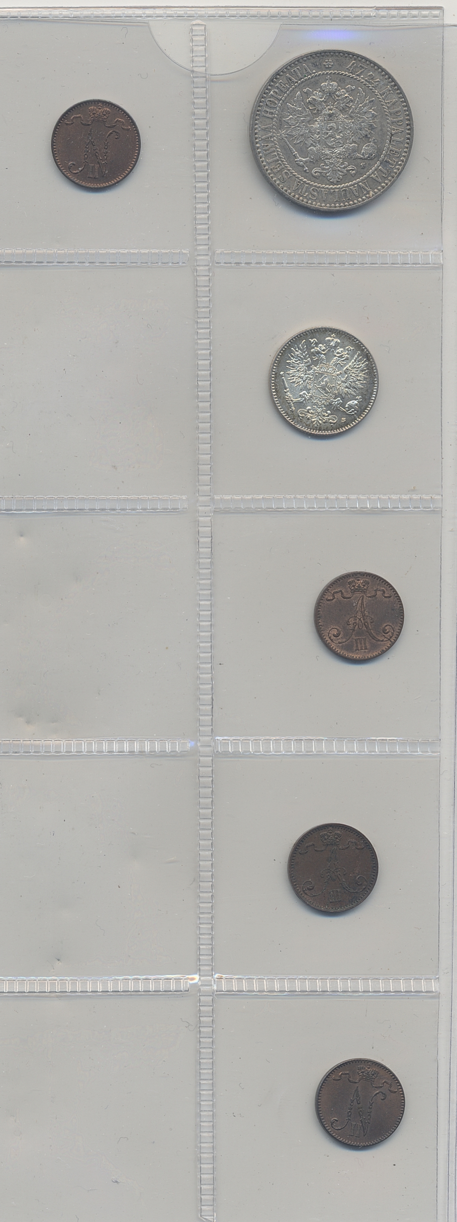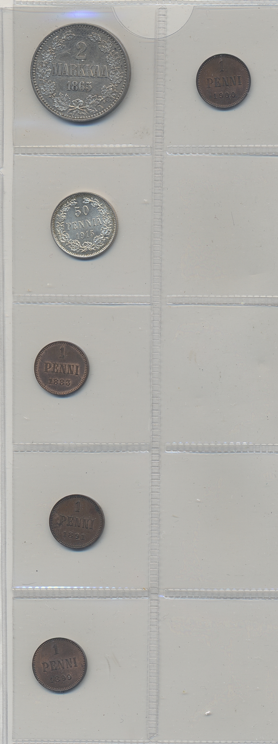 Coins, Finland. Collection of coins from Finland including 2 markkaa 1865. In total six pcs Please inspect! 1+/01 - 01/0.