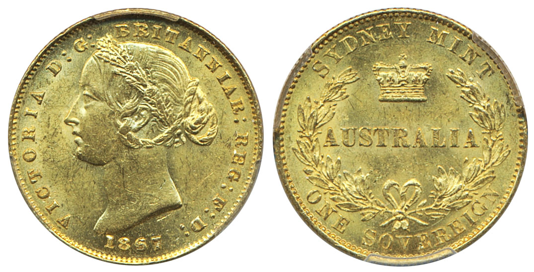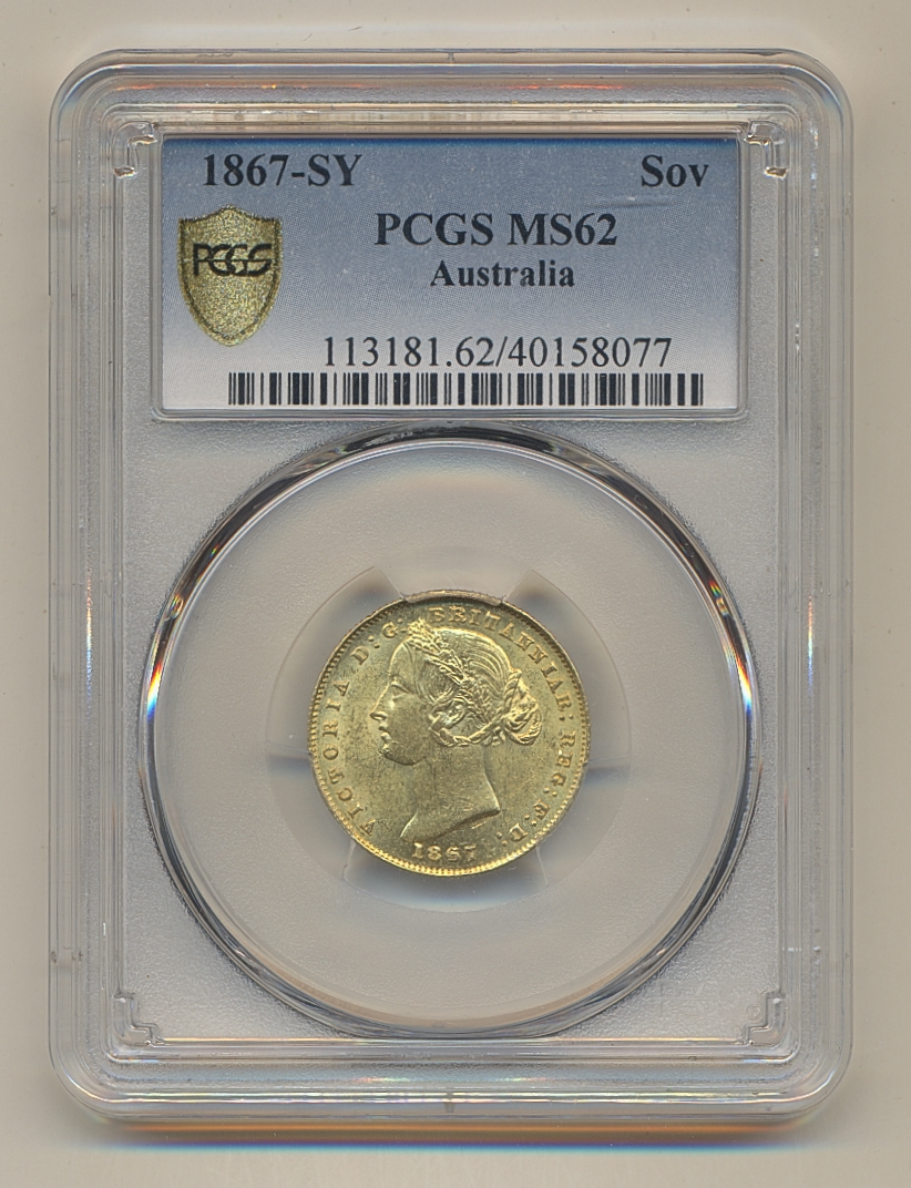 Coins, Australia. Queen Victoria (1837-1901), KM 4, 1 sovereign 1867. Sydney mint. Graded by PCGS as MS62. XF-UNC. See certification at PCGS