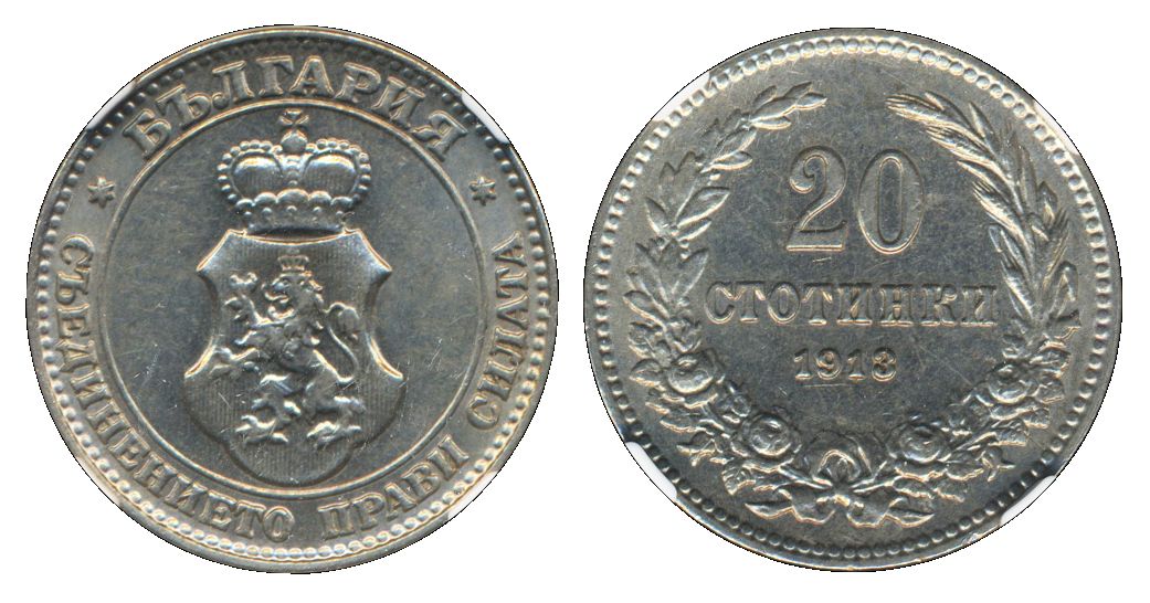 Coins, Bulgaria. Ferdinand I (1887-1918), KM 26, 20 stotinki 1913. Graded by NGC as MS62. XF-UNC. See certification at NGC