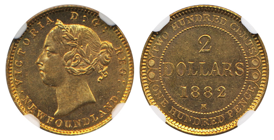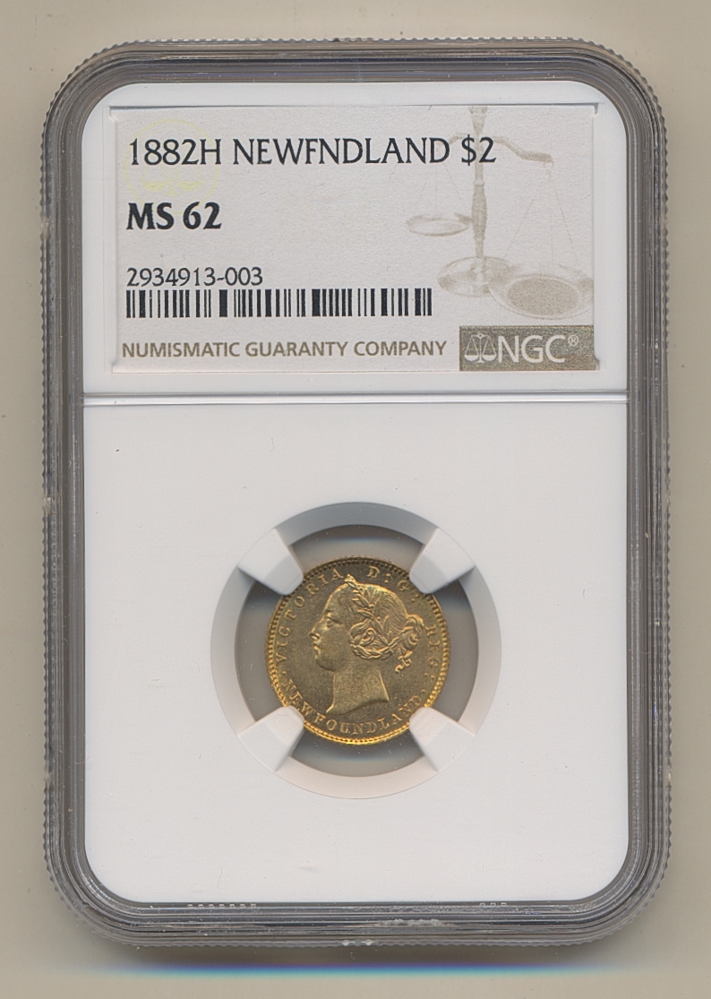 Coins, Canada, Newfoundland. Queen Victoria (1837-1901), KM 5, 2 dollars 1882 H. Graded by NGC as MS62. XF-UNC. See certification at NGC