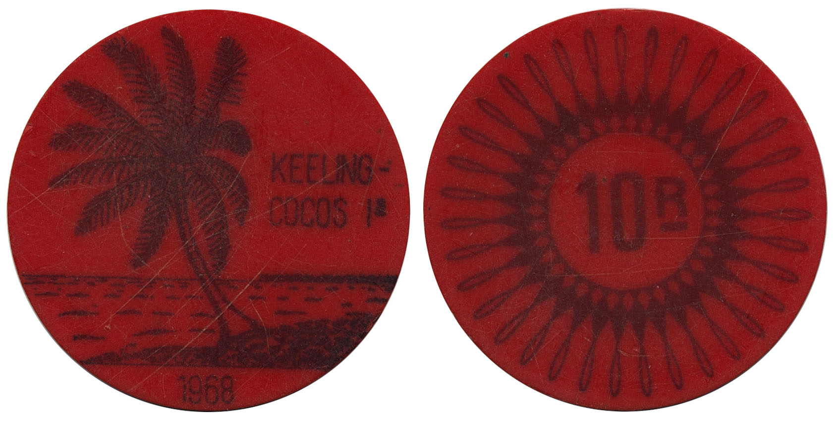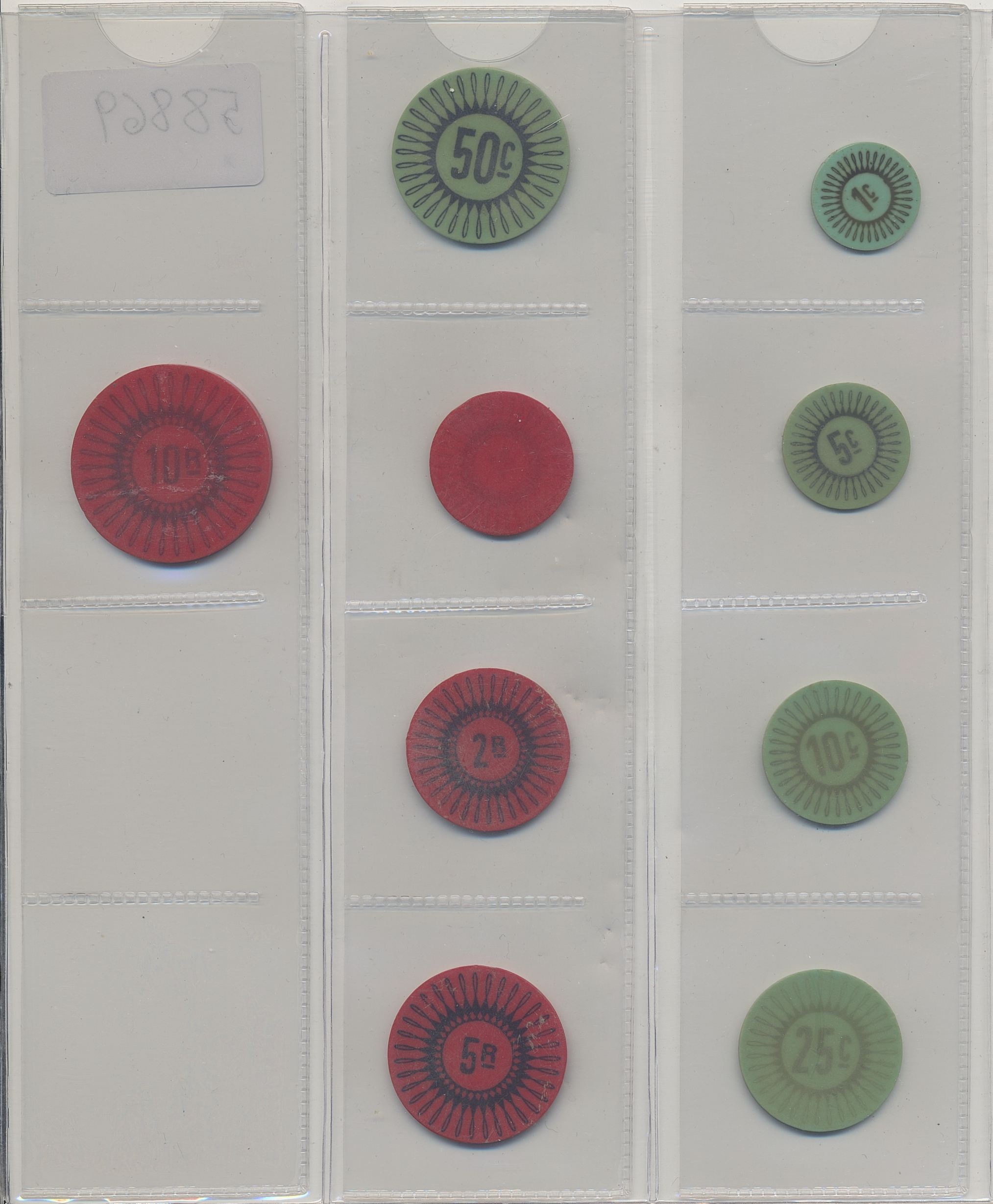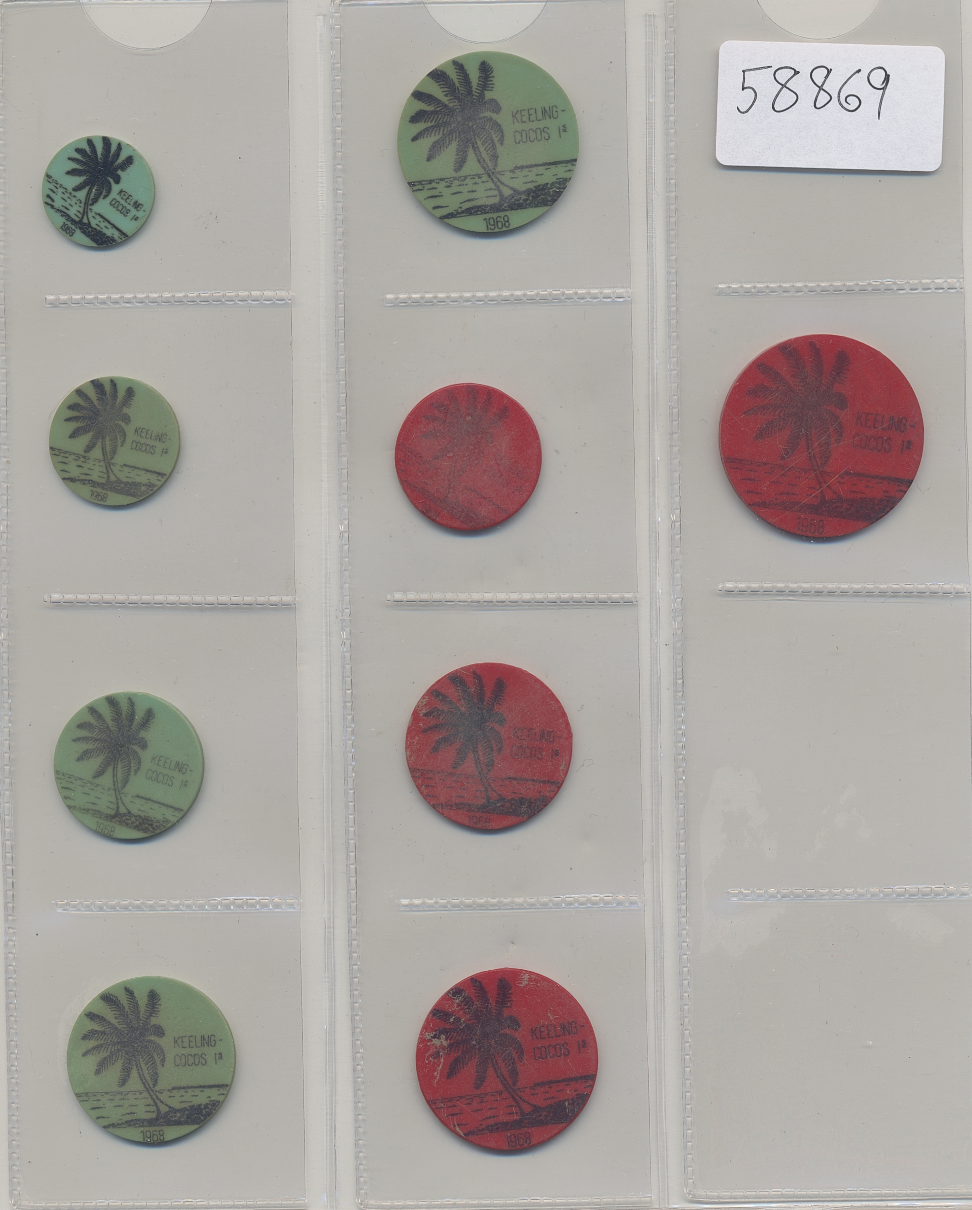 Coins, Cocos (Keeling) Islands. KM Tn8-Tn16, SET of nine tokens, 1968, a nearly complete set of these elusive 1968-series plastic tokens, only missing the 25 rupee. Some tokens showing light wear or discoloration. VF-XF/UNC.