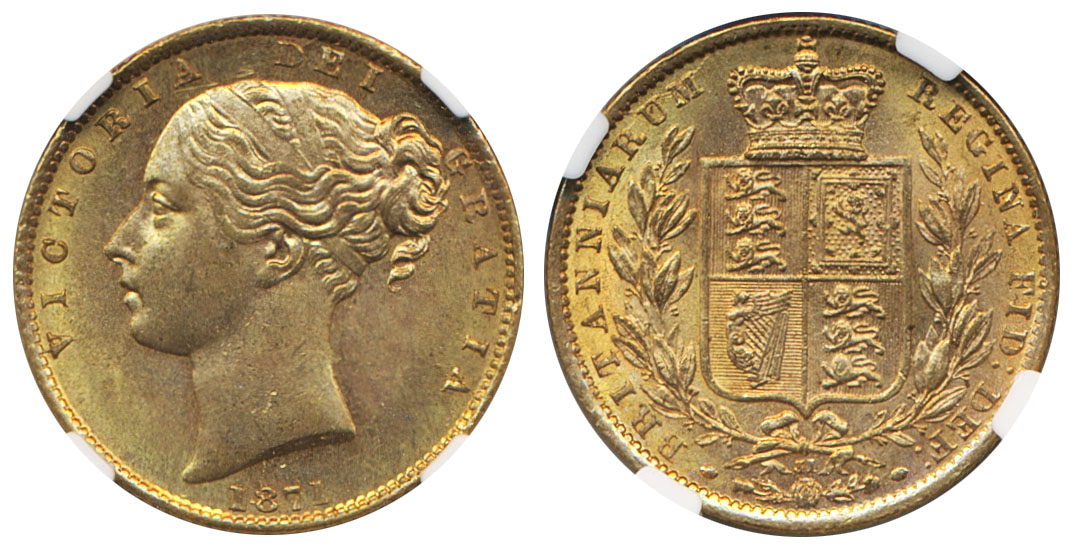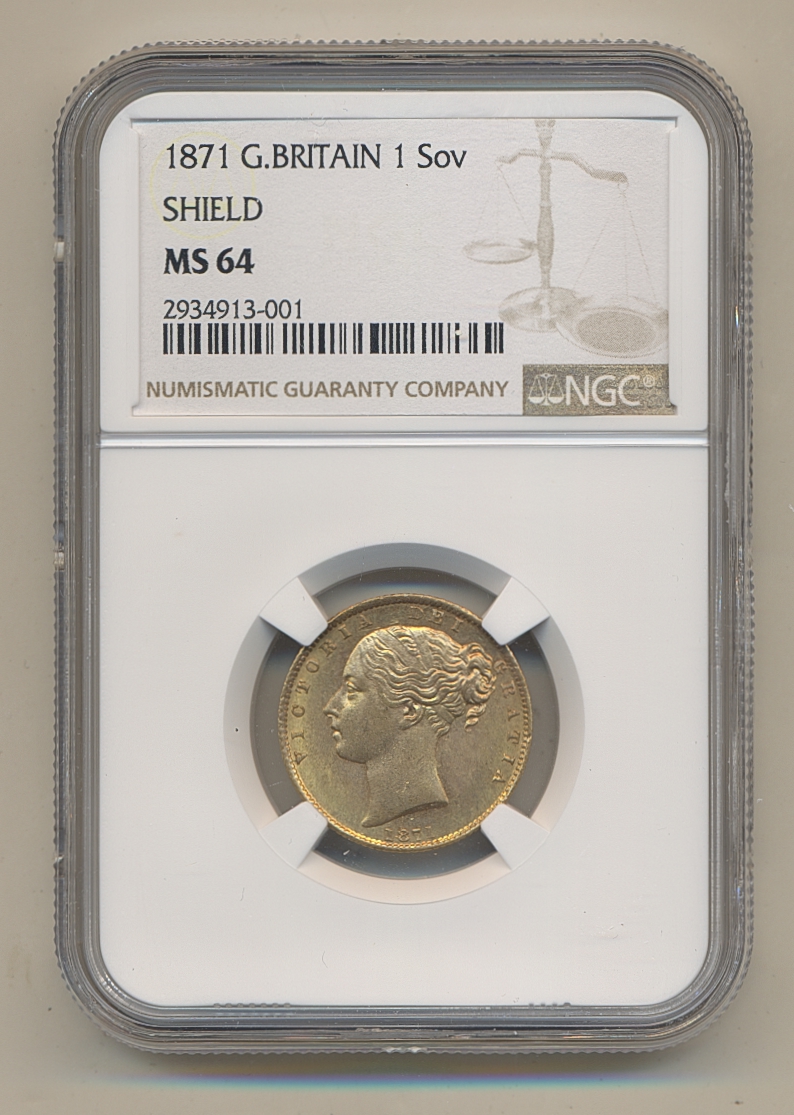Coins, Great Britain. Victoria, Spink 3853B, 1 sovereign 1871. Die number 31. Graded by NGC as MS64. XF-UNC. See certification at NGC
