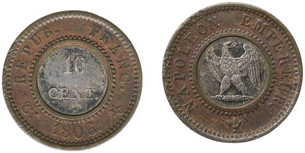 Coins, France. Napoleon I, 10 cent 1806. Bimetallic AR-CU Essai de 10 Centimes (21 mm, 1.85 g.). Paris mint. By Tiolier. NAPOLEON EMPEREUR (bee), Eagle standing facing atop thunderbolt with wings spread, head left / REPUB. FRANC. (monogram) 1806 (star), 10/ CENT. Mazard 593. XF-UNC.