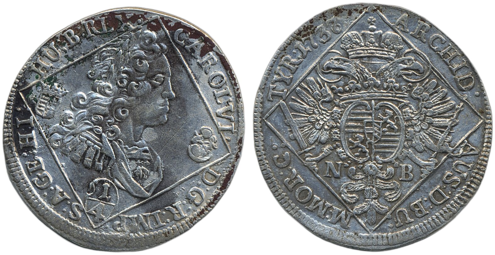 Coins, Hungary. Karl VI (1711-40), KM 305, 1/4 taler 1737. 6.91 g. Nagybanya mint. Obverse with some deposits. VF.