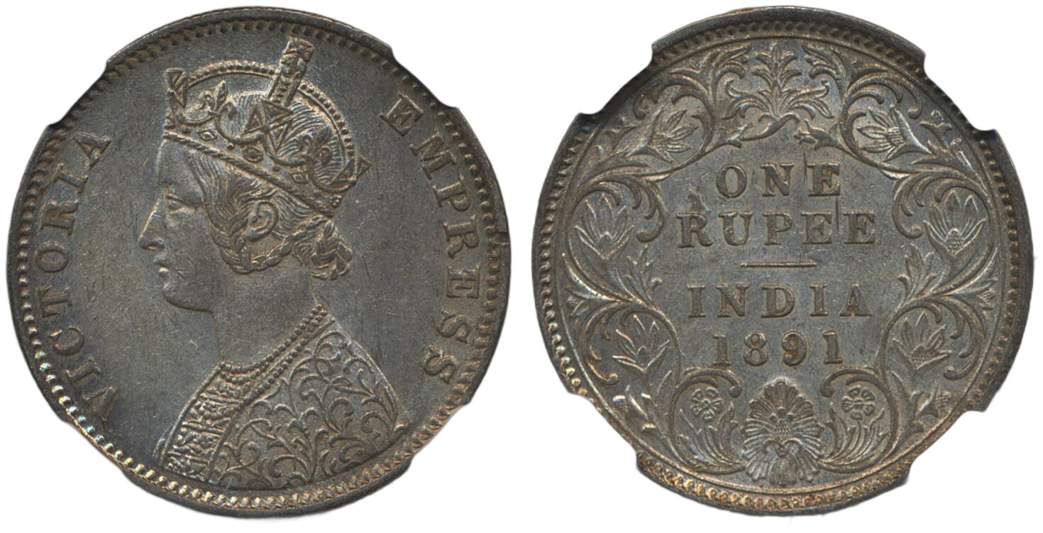 Coins, India. Queen Victoria (1837-1901), KM 492, 1 rupee 1891. Calcutta mint. Graded by NGC as AU55. XF. See certification at NGC