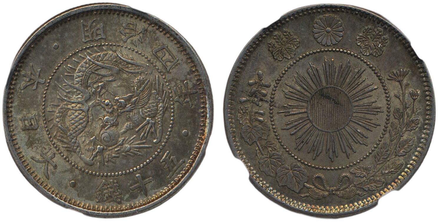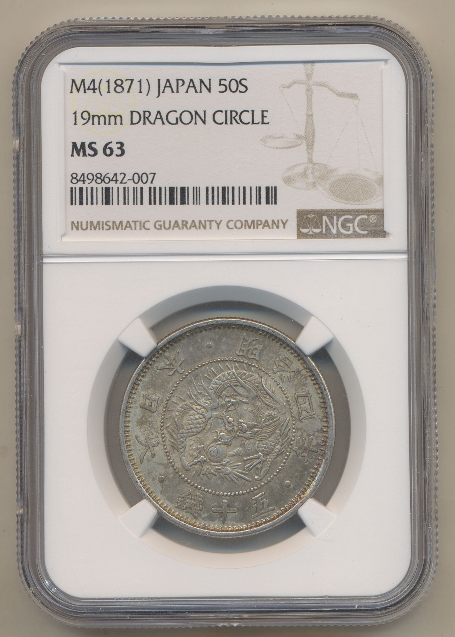 Coins, Japan. Mutsuhito (1868-1912), KM Y-4A.1, 50 sen 1871 (Meiji 4). Graded by NGC as MS63. XF-UNC. See certification at NGC