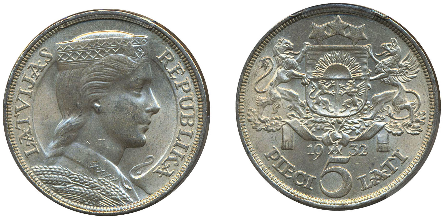 Coins, Latvia. KM 9, 5 lati 1932. Graded by PCGS as MS63. XF-UNC. See certification at PCGS