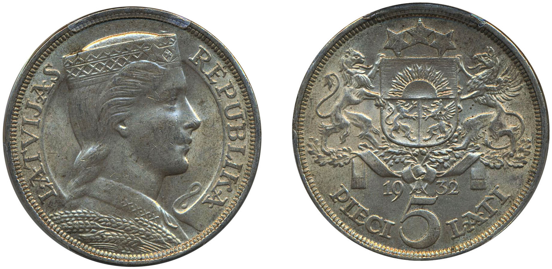Coins, Latvia. KM 9, 5 lati 1932. Graded by PCGS as MS61. XF-UNC. See certification at PCGS