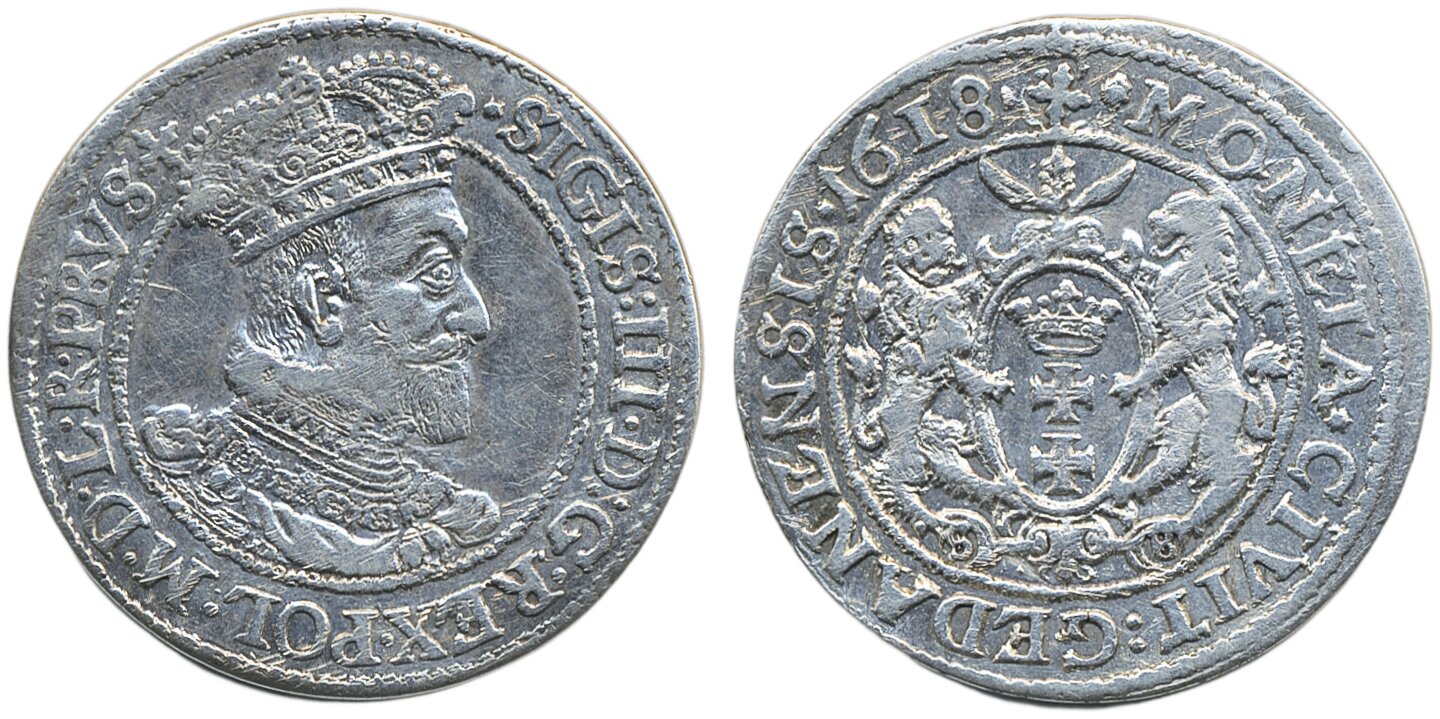 Coins, Poland, Danzig. Sigismund III Vasa, KM 14, Ort (¼ thaler – 10 groszy) 1618 SB. 6.22 g. Cleaned. VF.