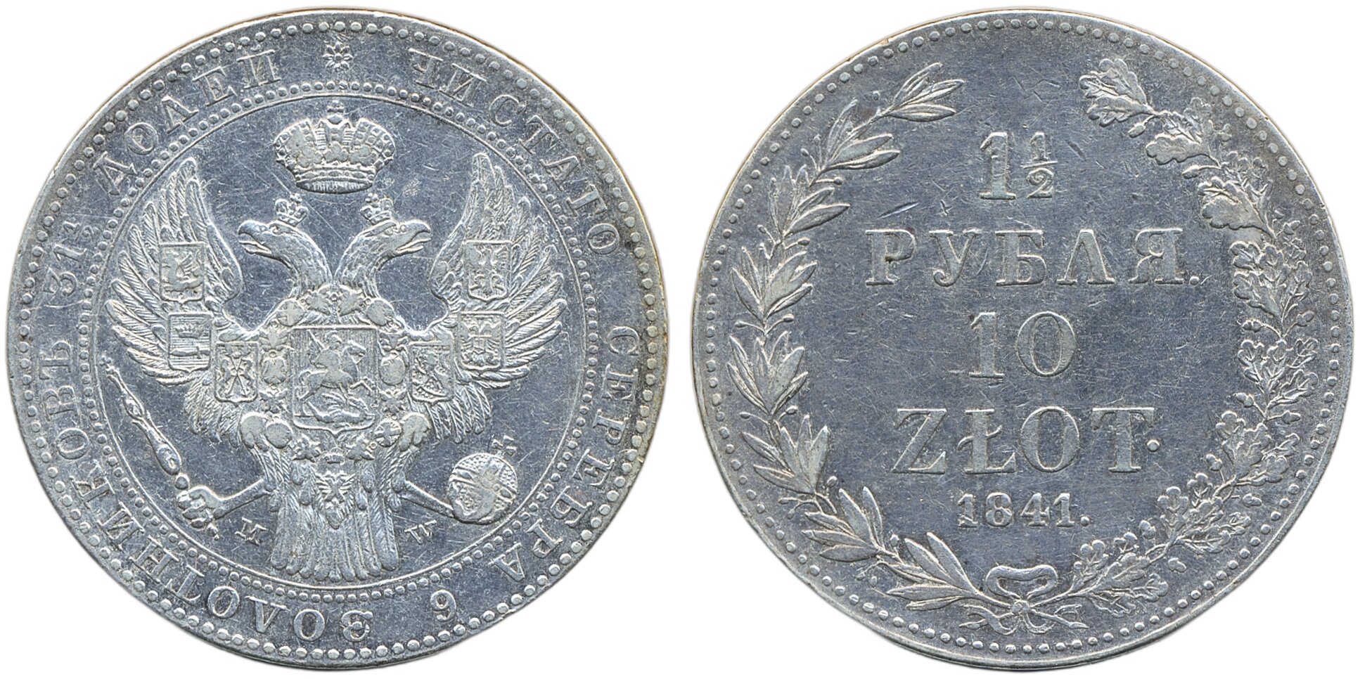 Coins, Poland. Nicholas I, Bitkin 1137 (R), 10 zlotych 1841. Cleaned. Kopicki 9458 (R2). F-VF.
