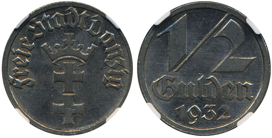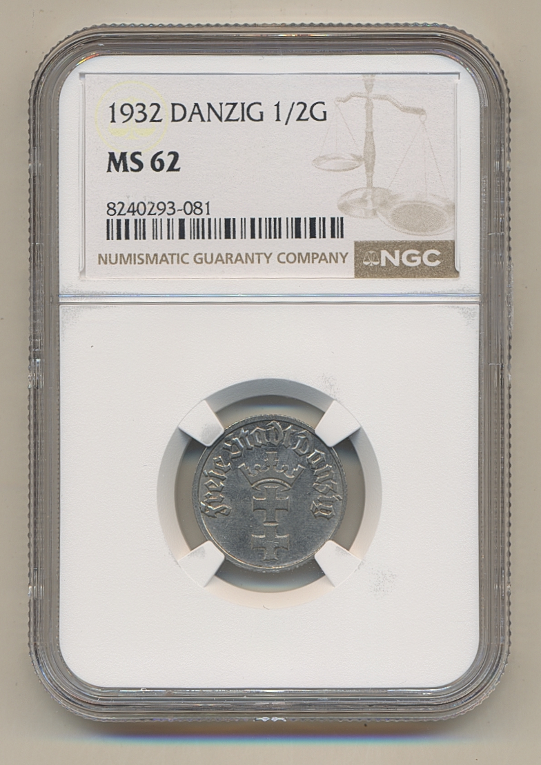 Coins, Poland, Danzig. KM 153, ½ gulden 1932. Graded by NGC as MS62. XF-UNC. See certification at NGC