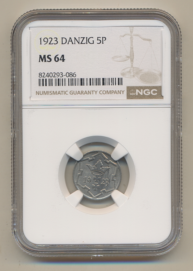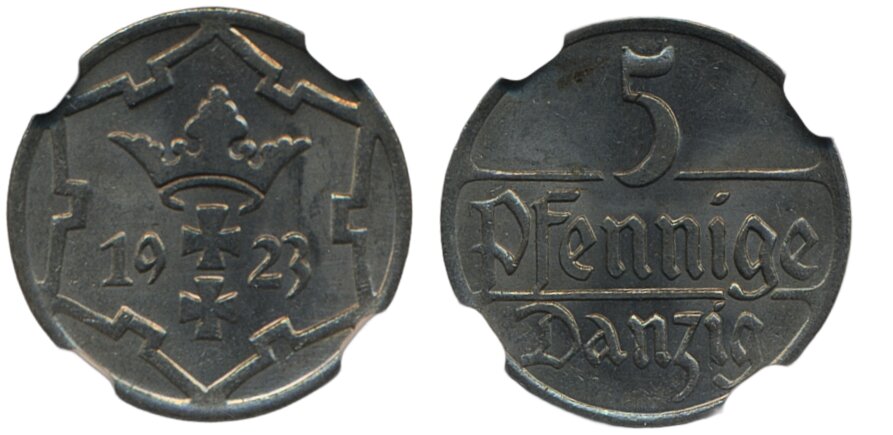 Coins, Poland, Danzig. KM 142, 5 pfennig 1923. Graded by NGC as MS64. XF-UNC. See certification at NGC