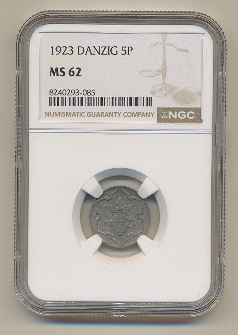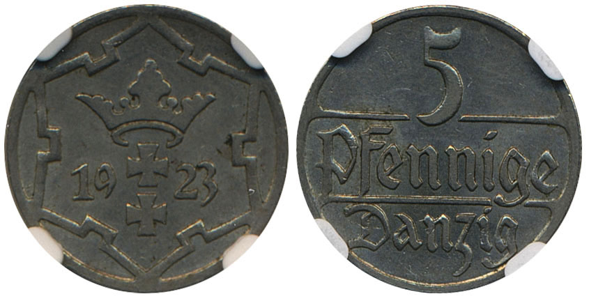 Coins, Poland, Danzig. KM 142, 5 pfennig 1923. Graded by NGC as MS62. XF-UNC. See certification at NGC