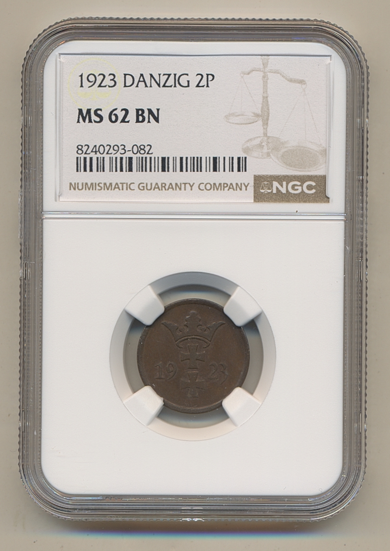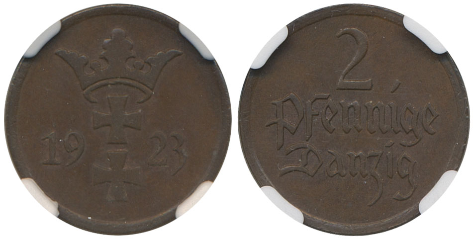 Coins, Poland, Danzig. KM 141, 2 pfennig 1923. Graded by NGC as MS62 BN. XF-UNC. See certification at NGC