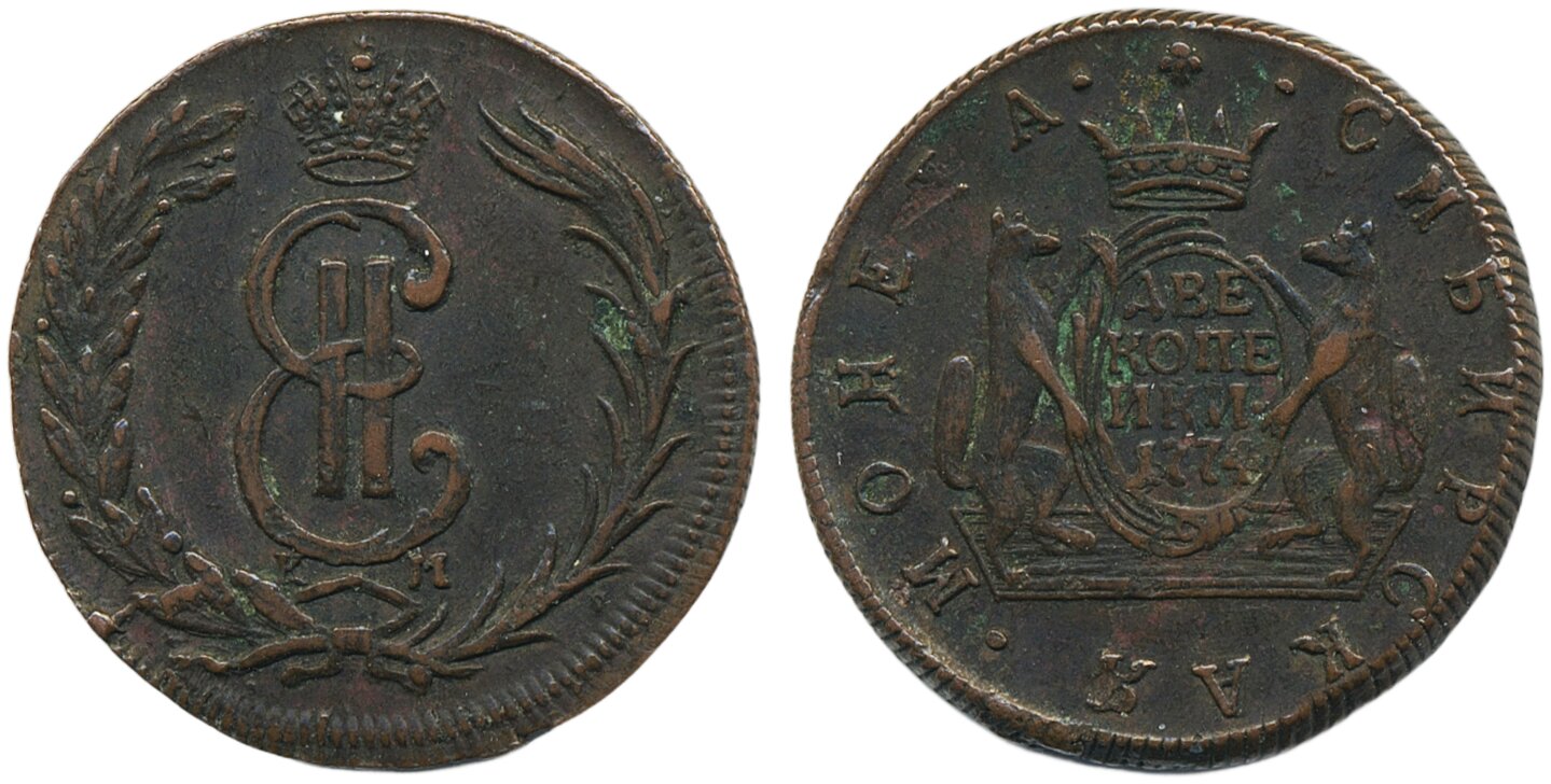 Coins, Russia, Siberia. Catherine II, Bitkin 1112, 2 kopeks 1774. 11.94 g. Suzun mint. VF-XF.