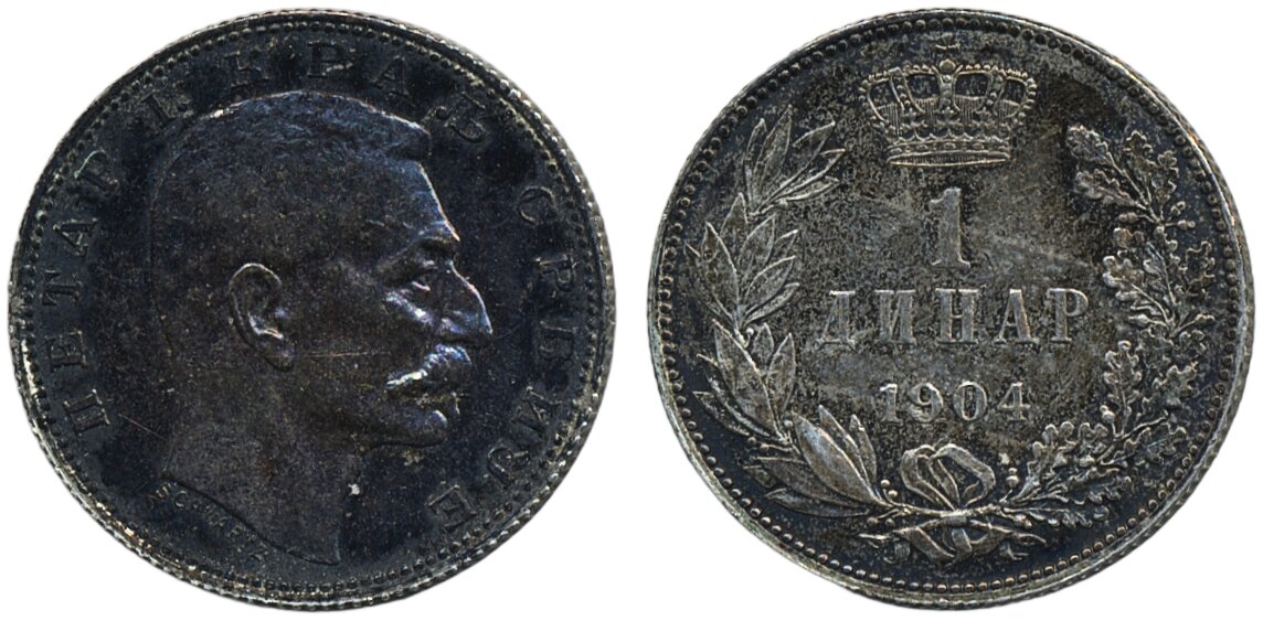 Coins, Serbia. Peter I (1903-1918), KM 25.1, 1 dinara 1904. Beautifully toned lustrous example. XF.