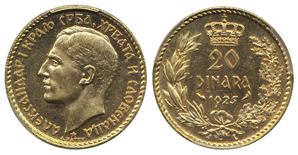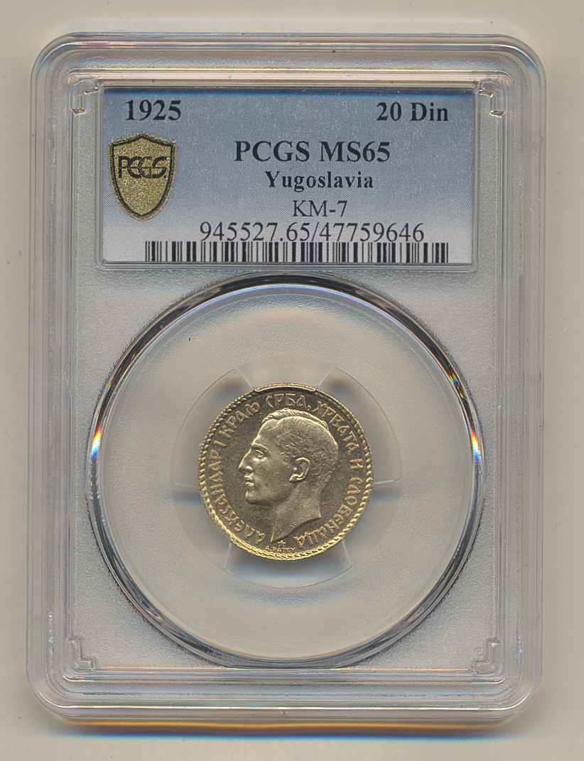 Coins, Yugoslavia. Alexander I (1921-29), KM 7, 20 dinara 1925. Graded by PCGS as MS65. UNC. See certification at PCGS