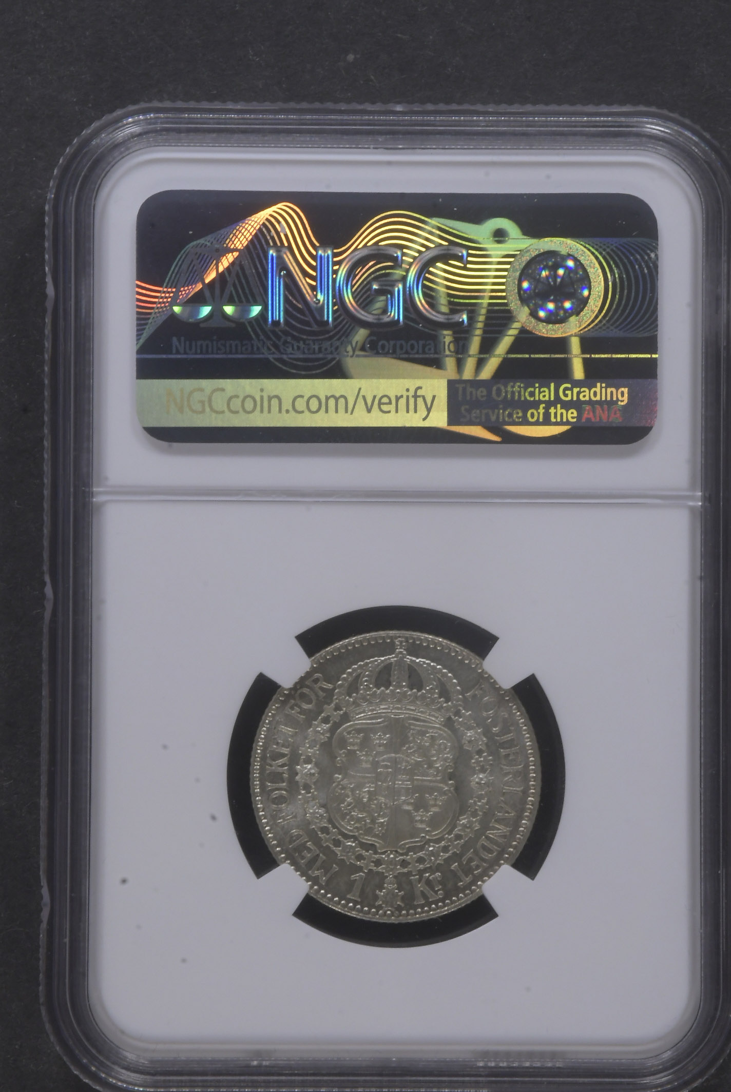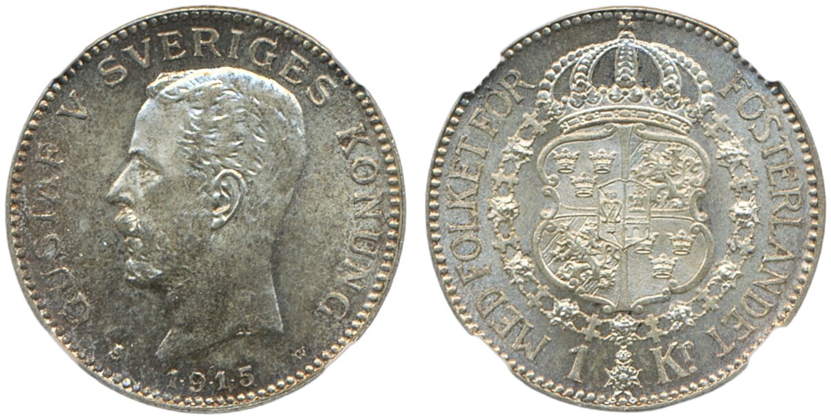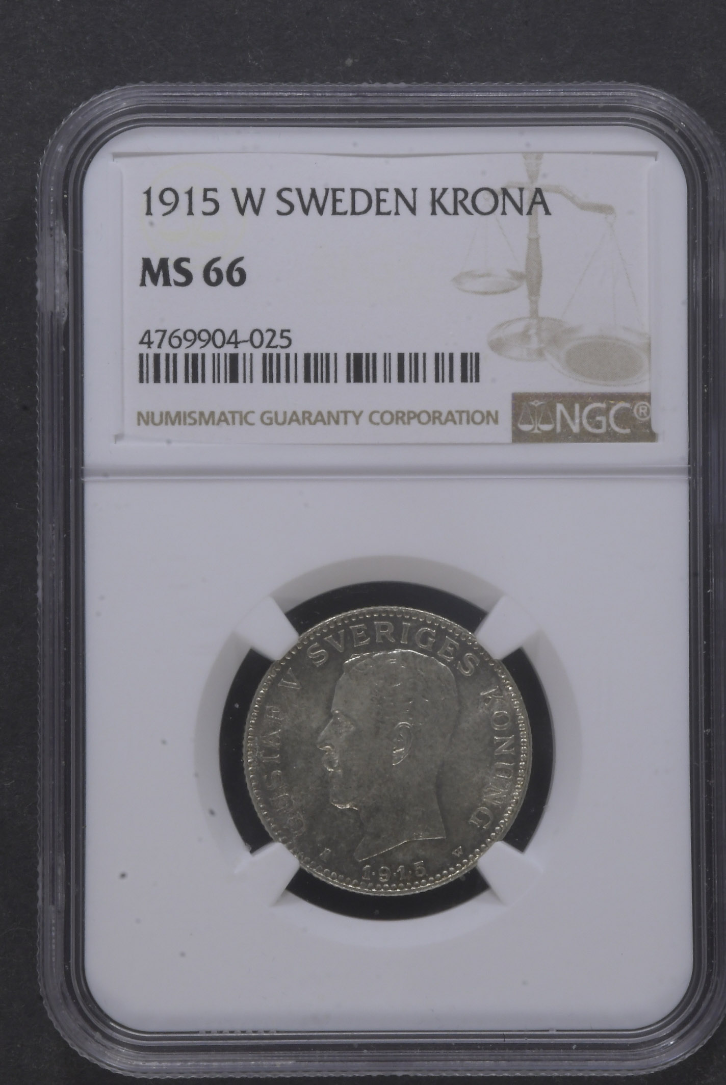 Coins, Sweden. Gustav V, MIS I.5c, 1 krona 1915. Graded by NGC as MS66. 0. See certification at NGC