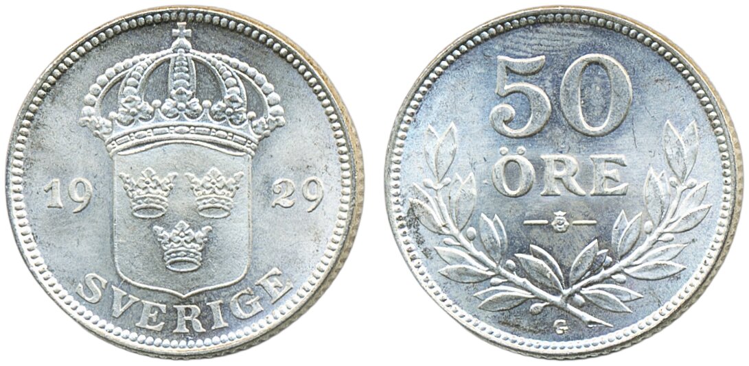 Coins, Sweden. Gustav V, MIS I.8, 50 öre 1929. 01/0.