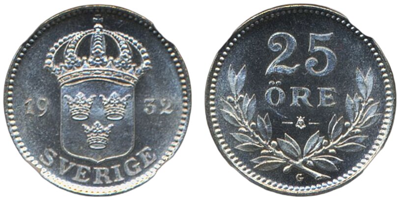 Coins, Sweden. Gustav V, MIS I.13, 25 öre 1932. Graded by NGC as MS65. 0. See certification at NGC