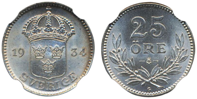 Coins, Sweden. Gustav V, MIS I.15, 25 öre 1934. Graded by NGC as MS65. 0. See certification at NGC
