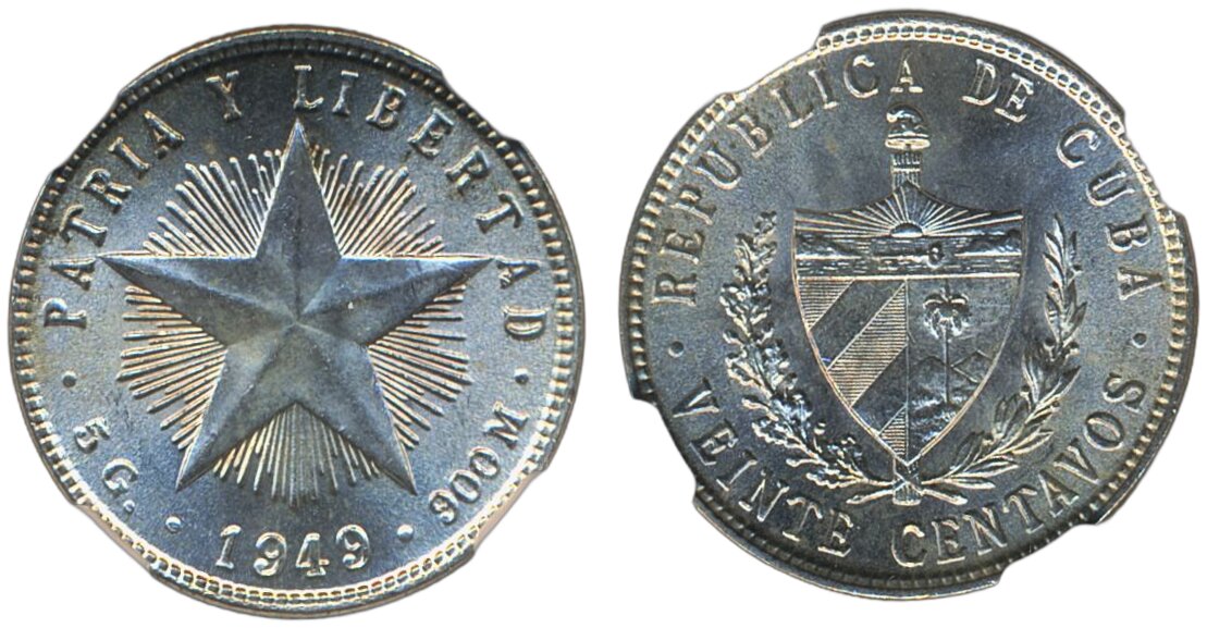 Coins, Cuba. KM 13.2, 20 centavos 1949. Graded by NGC as MS65. UNC. See certification at NGC