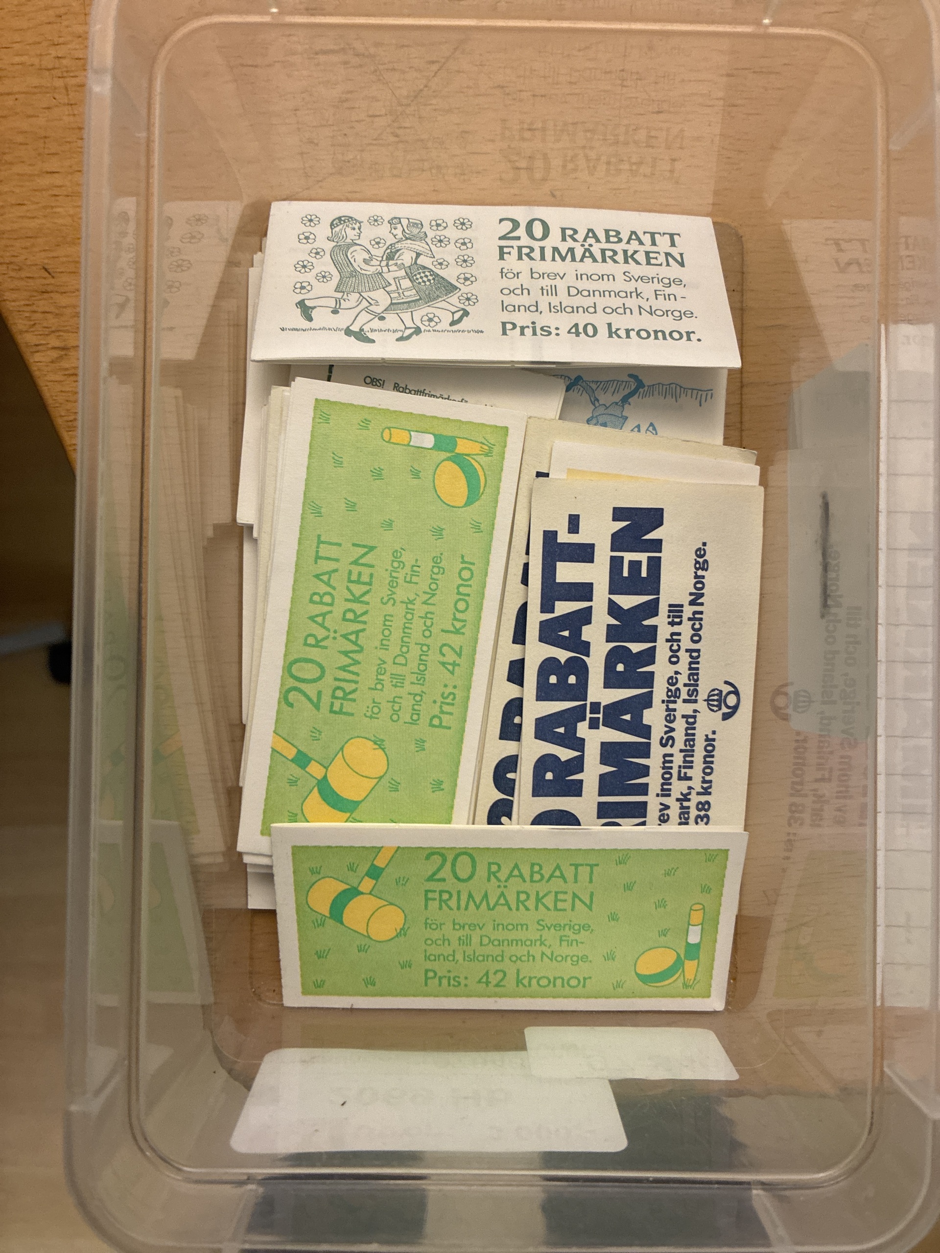 Sweden. Discount stamp booklets, accumulation 1981–1990 in box. 30 discount stamp booklets with stamps for use within the Nordic countries. Excellent quality.