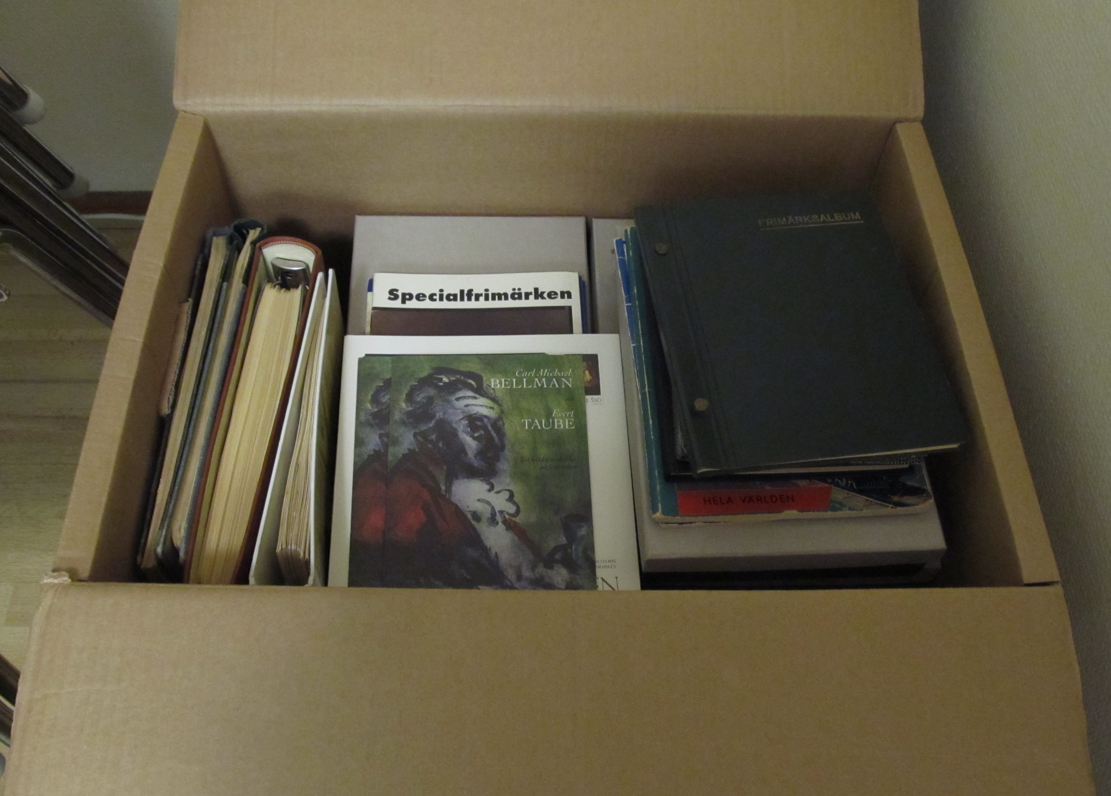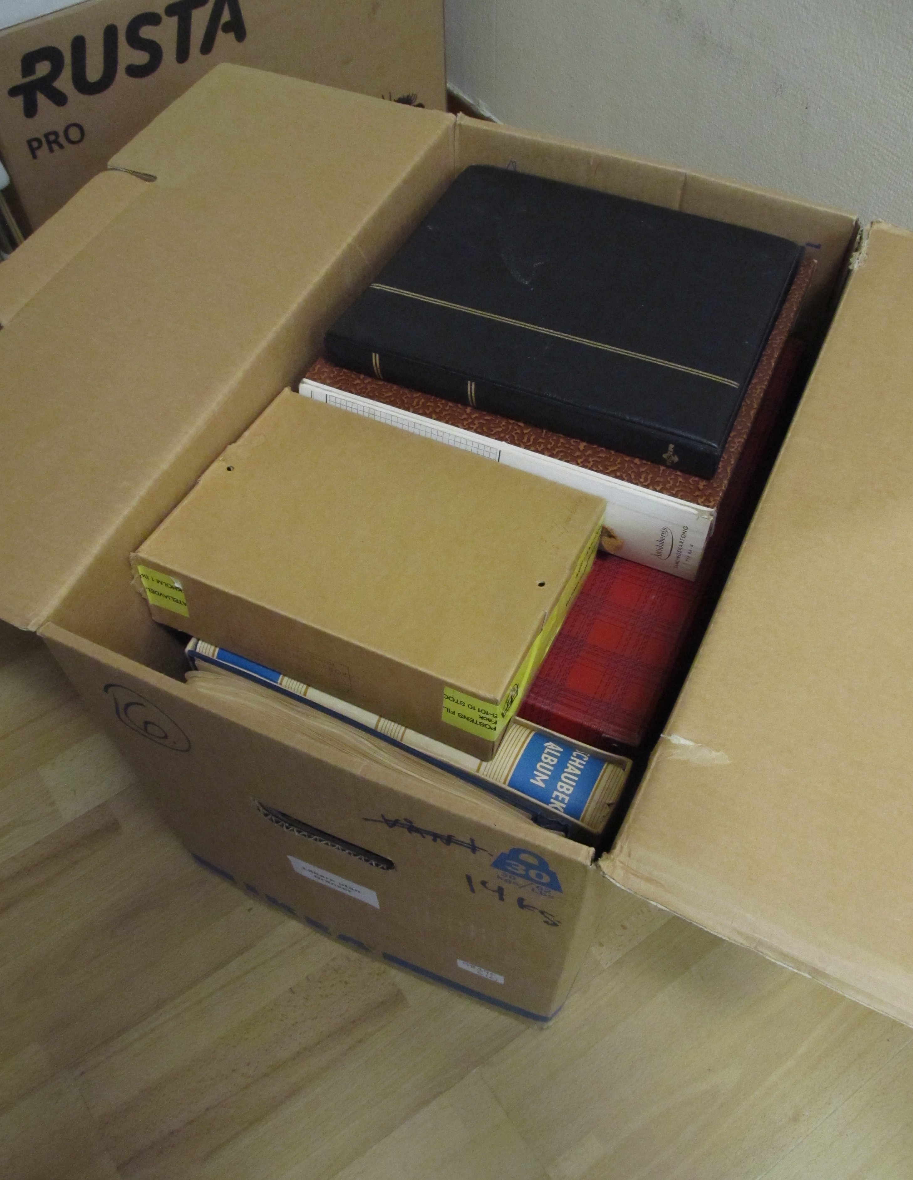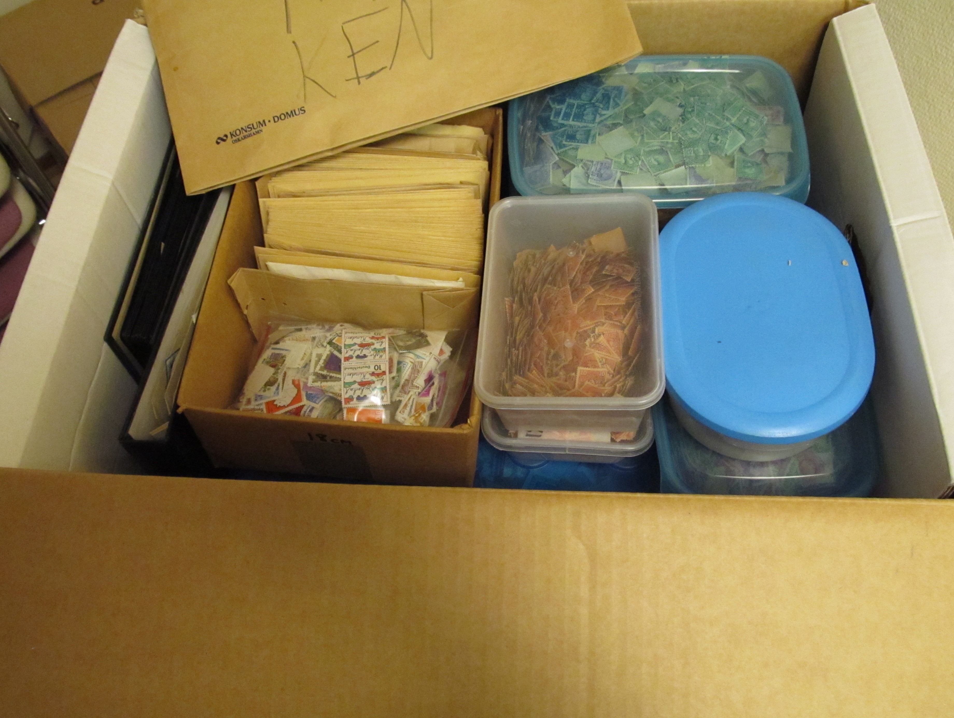 ALL WORLD. Accumulation ★★/★/⊙ in six removal boxes. Containing stamps on and off paper in boxes, bags, envelopes and in about sixty various size stockbooks and albums. Incl. some Swedish face value, e.g. 1970s year sets. To be sold for the benefit of Läkare utan Gränser (MSF). N.B. Needs to be picked up at our office, due to the high shipping cost and to avoid the handling fee. Approx. 97 kg.