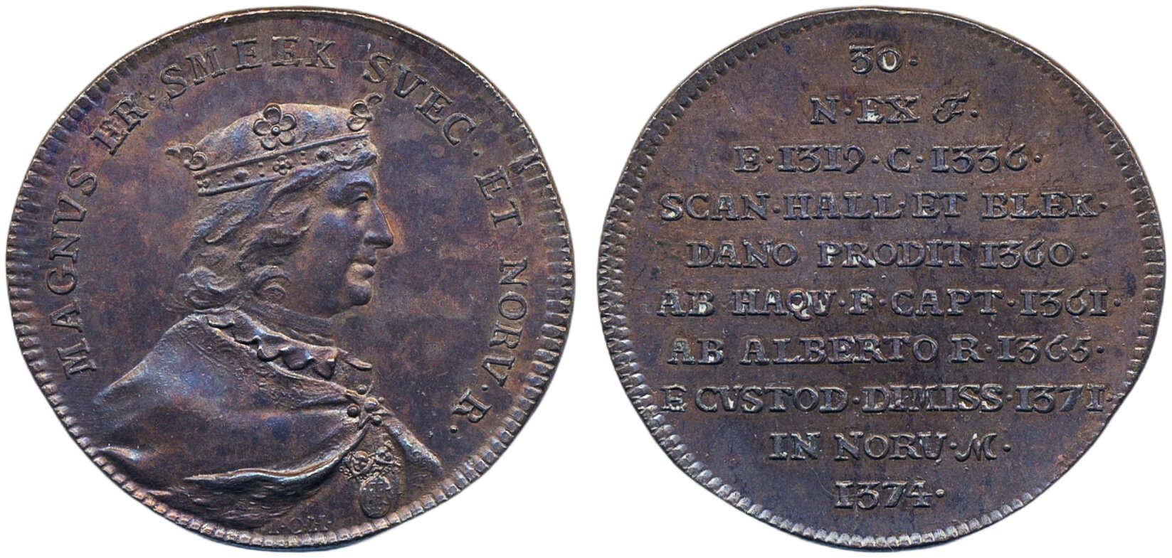 Medals, regal, Sweden. Magnus Eriksson, Hild. 30, Hedlingers regentlängd (Hedlinger's set of regents). No 30. Bronze medal, 35 mm, 13.30 g. SKM 31c. 01/0.
