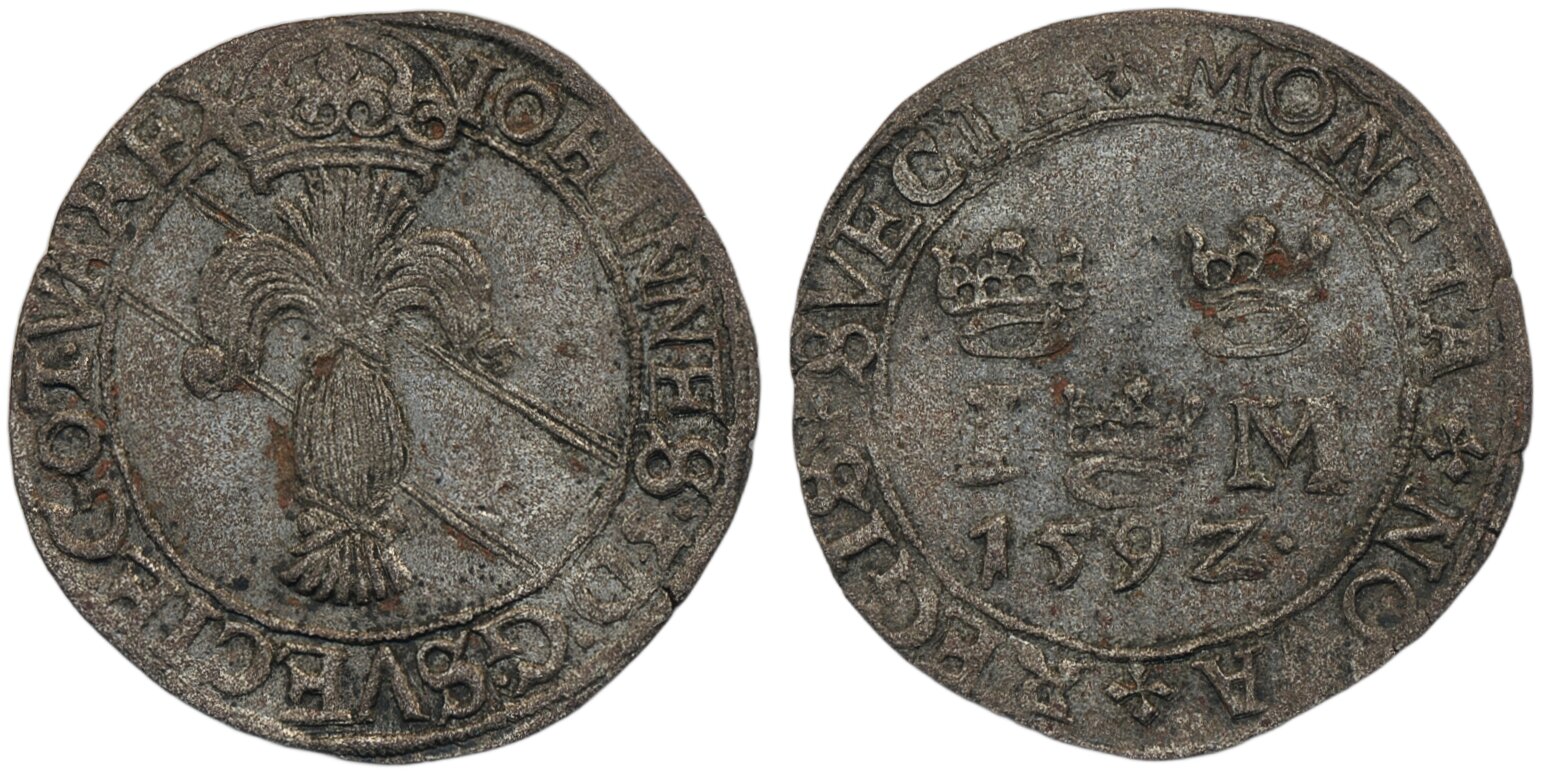 Coins, Sweden. Johan III, SM 63a, 1 mark 1592. Well struck example, minor surface corrosion. Ex Myntkompaniet 7 lot 15. 01.