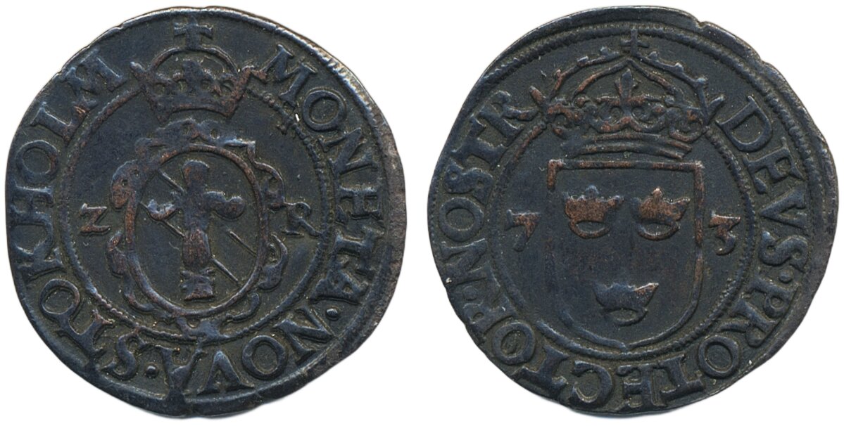 Coins, Sweden. Johan III, SM 75b, 2 öre 1573. 2.56 g. Stockholm. 1+.