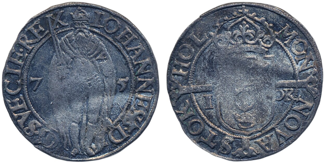 Coins, Sweden. Johan III, SM 81a, 1 öre 1575. 2.68 g. Stockholm. Lustrous example, lightly bent. 1+/01.