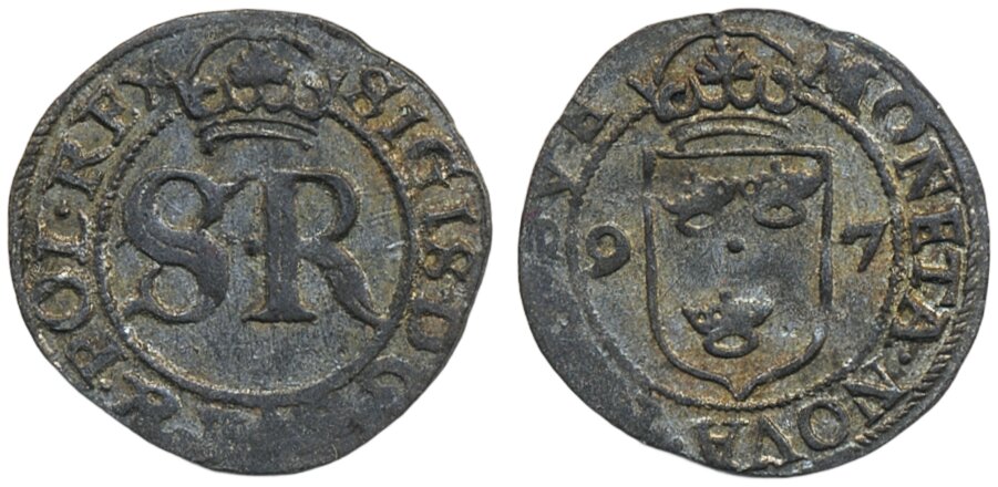 Coins, Sweden. Sigismund, SM 28, 1 fyrk 1597. 1.09 g. Stockholm. Beuatiful example with lustre. 01.