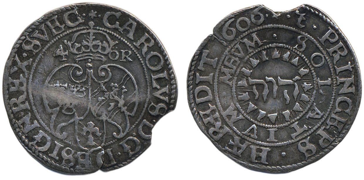 Coins, Sweden. Karl IX, SM 65, 4 öre 1606. 2.15 g. Stockholm. Edge loss and planchet flaw at edge. Has been bent, cleaned. 1+.