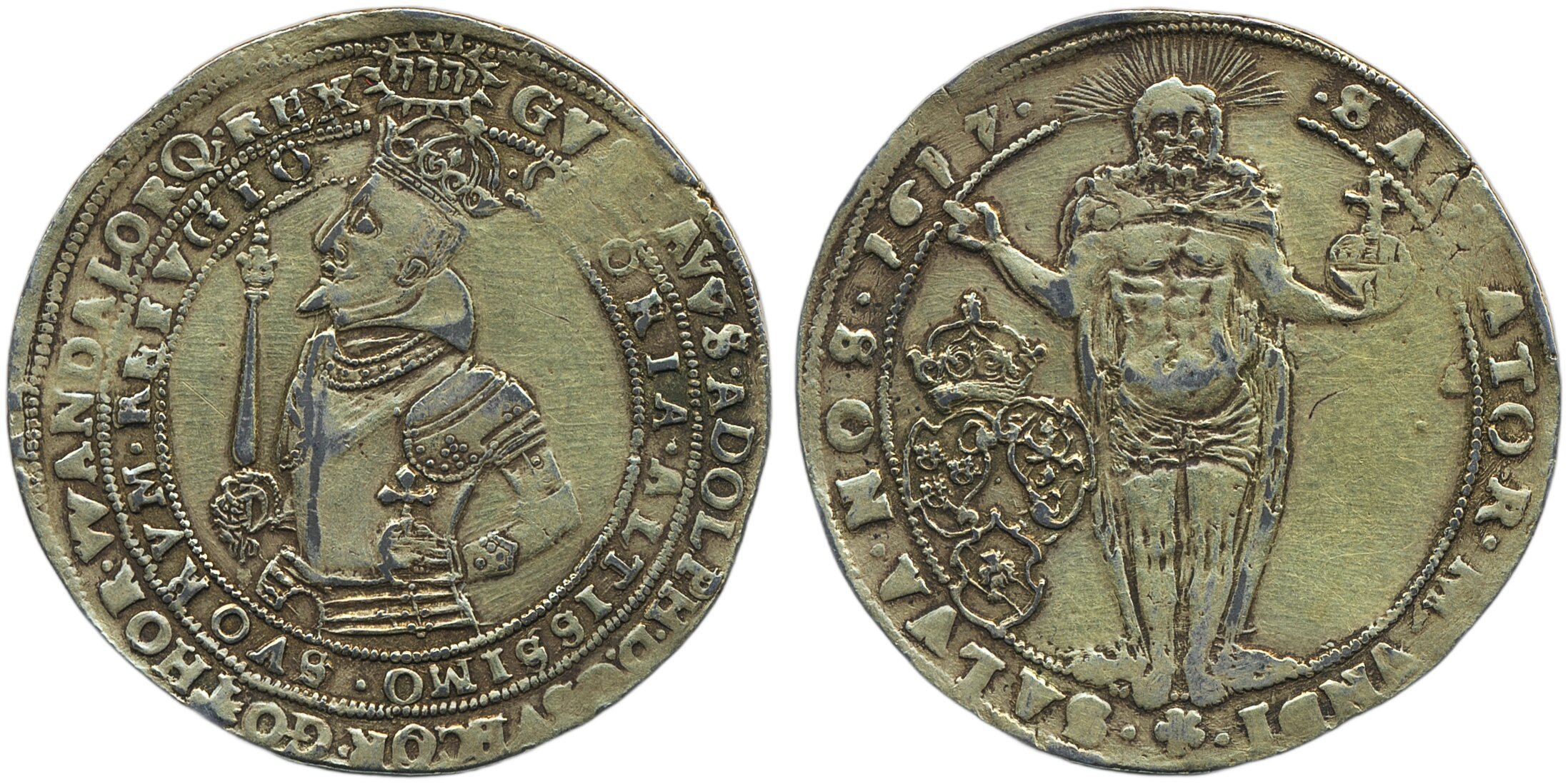 Coins, Sweden. Gustav II Adolf, SM 30, 1 riksdaler 1617. 31.93 g. Stockholm. Gilt and tooled. 1/1+.